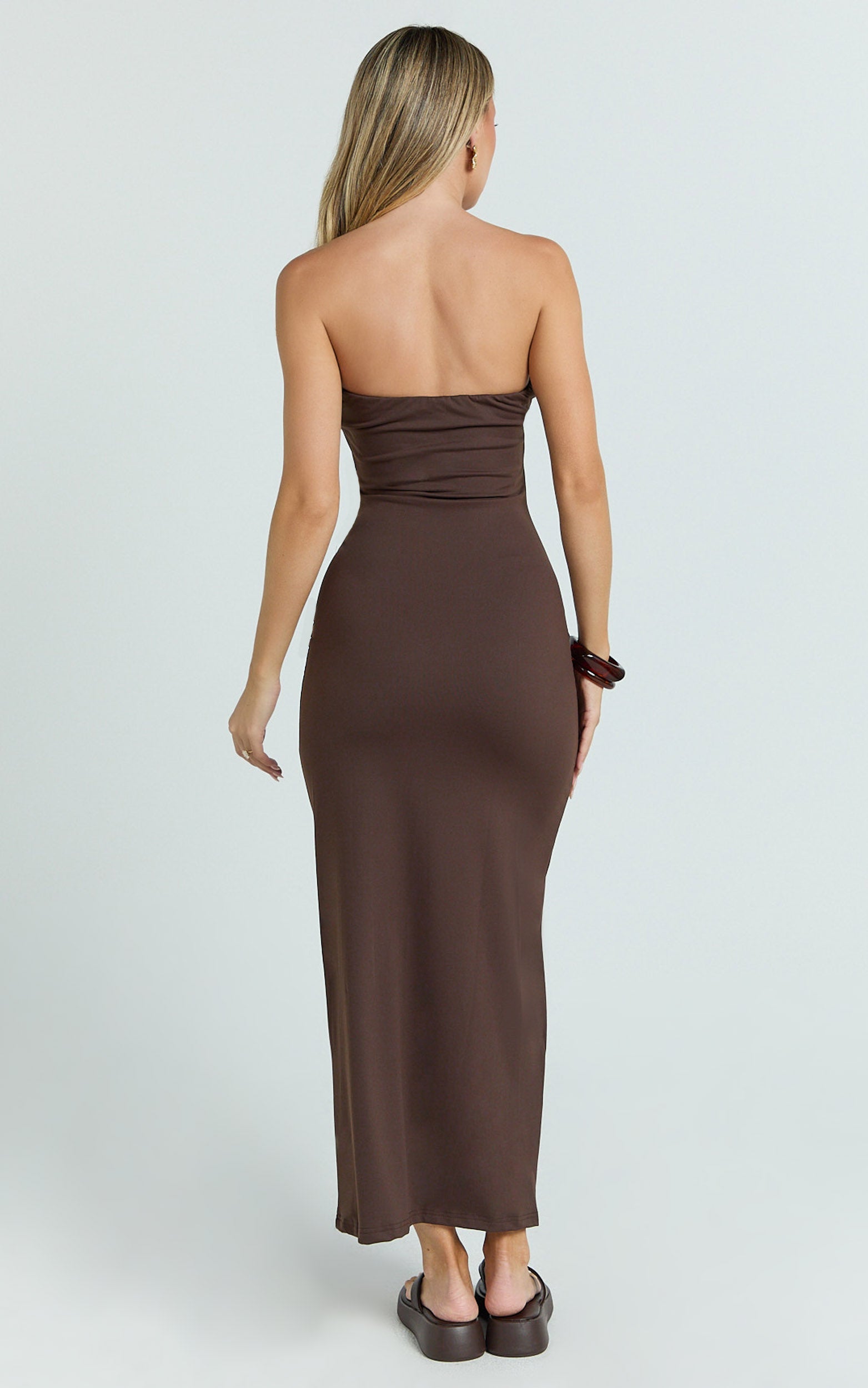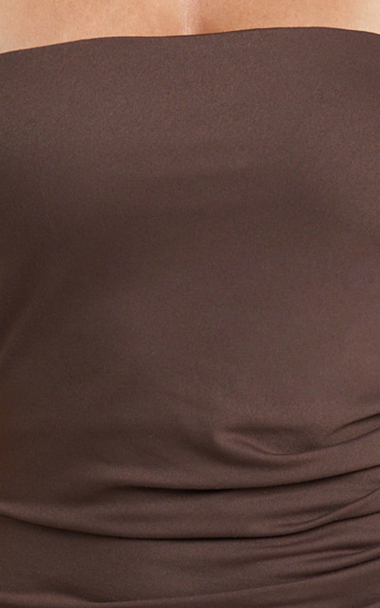 Natasha Midi Dress serves body-ody confidence with a secure strapless neckline, flattering side ruching, and a statuesque profile that elongates your frame. This is one of those dresses that does it all—desk to dinner, weddings to events—just add polished jewellery and a clutch and you’re ready. A chocolate dream that proves brown is the new black.