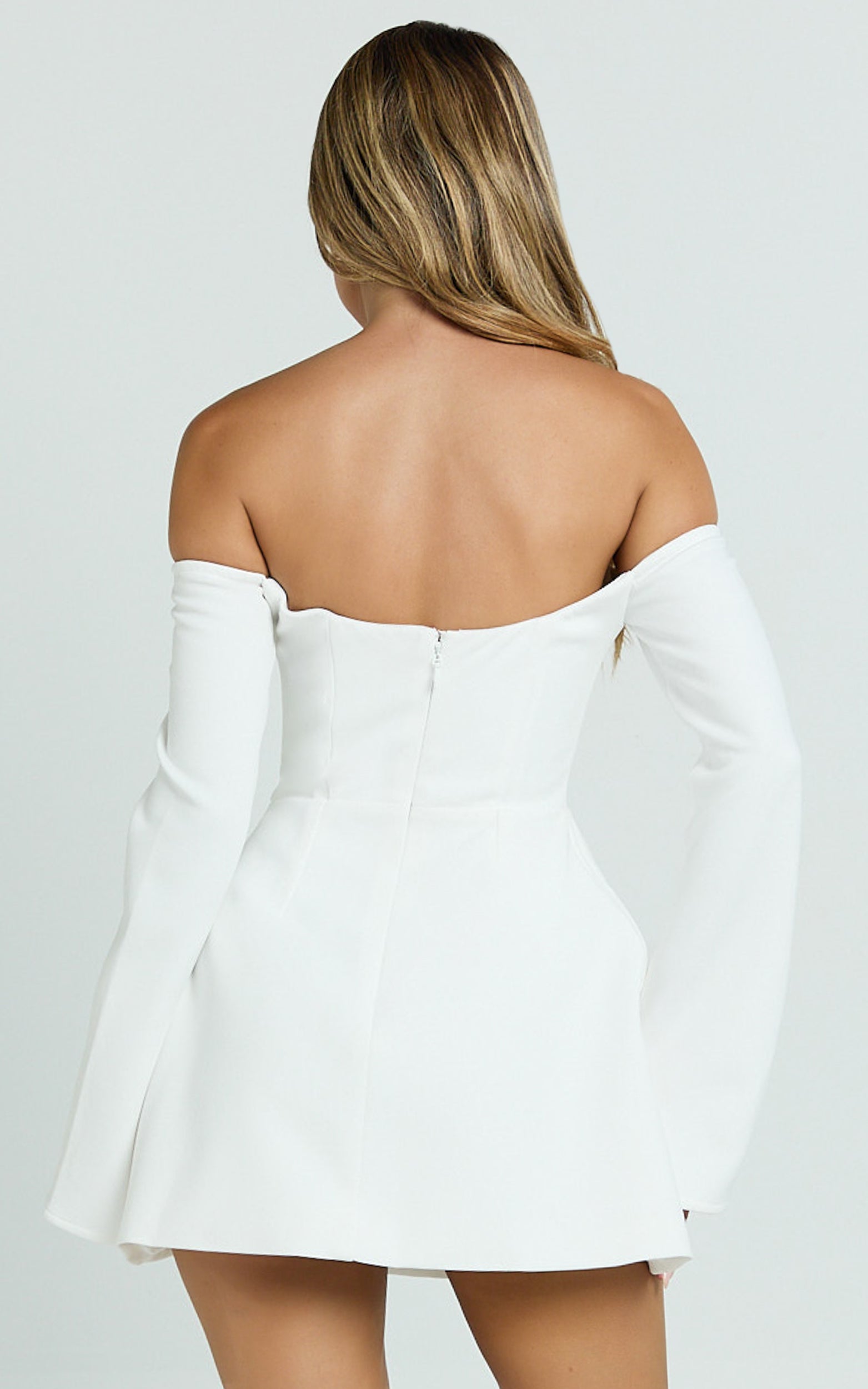The long sleeves balance the leg-baring hem, while the nipped waist and swishy skirt bring instant movement, perfect for twirls, date nights, and every RSVP. Tapping into naked dressing with a tasteful twist, it’s sleek, minimal, and made to glow in photos.