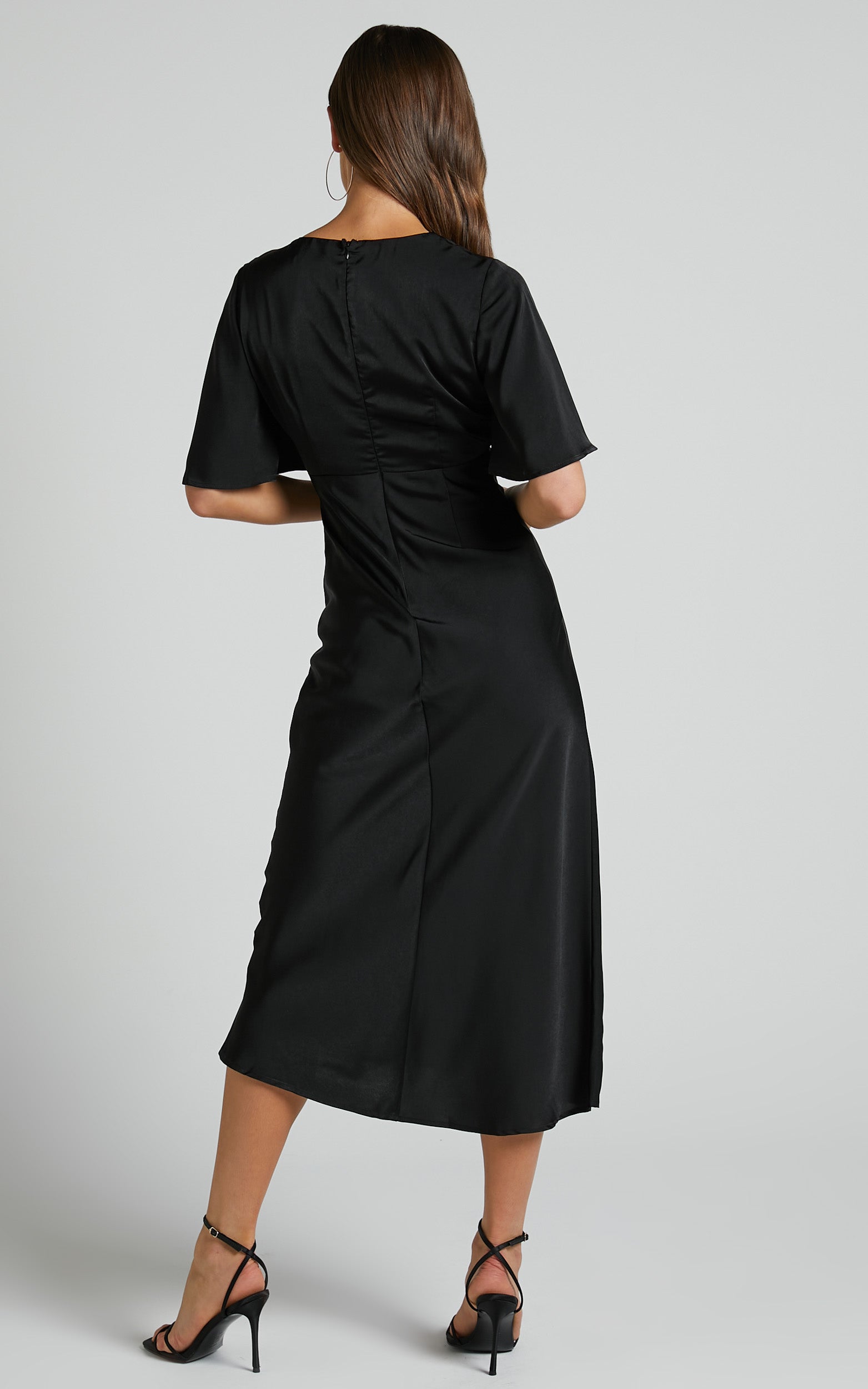The Nicholla Midi Dress channels vintage-inspired charm through elegant ruched detailing and dreamy angel sleeves, creating a silhouette that's effortlessly flattering. Flaunt your curves in this sleek black midi, a perfect blend of monochrome sophistication and playful allure.