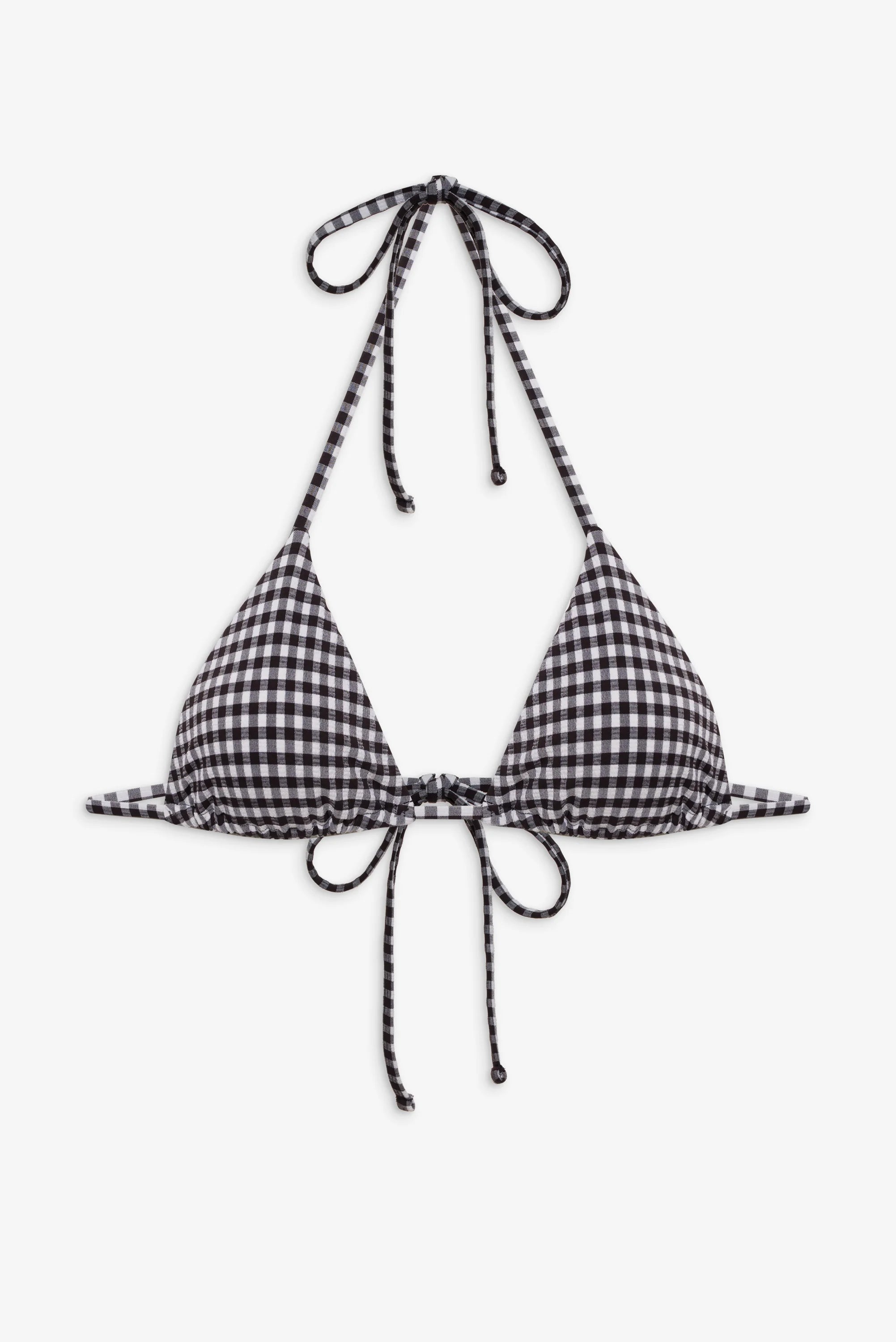 Our most tried-and-true triangle bikini top is here to stay. Nick features adjustable string ties that wrap around the neck and back for a personalized fit. Crafted in a textured Blackberry Gingham fabric.