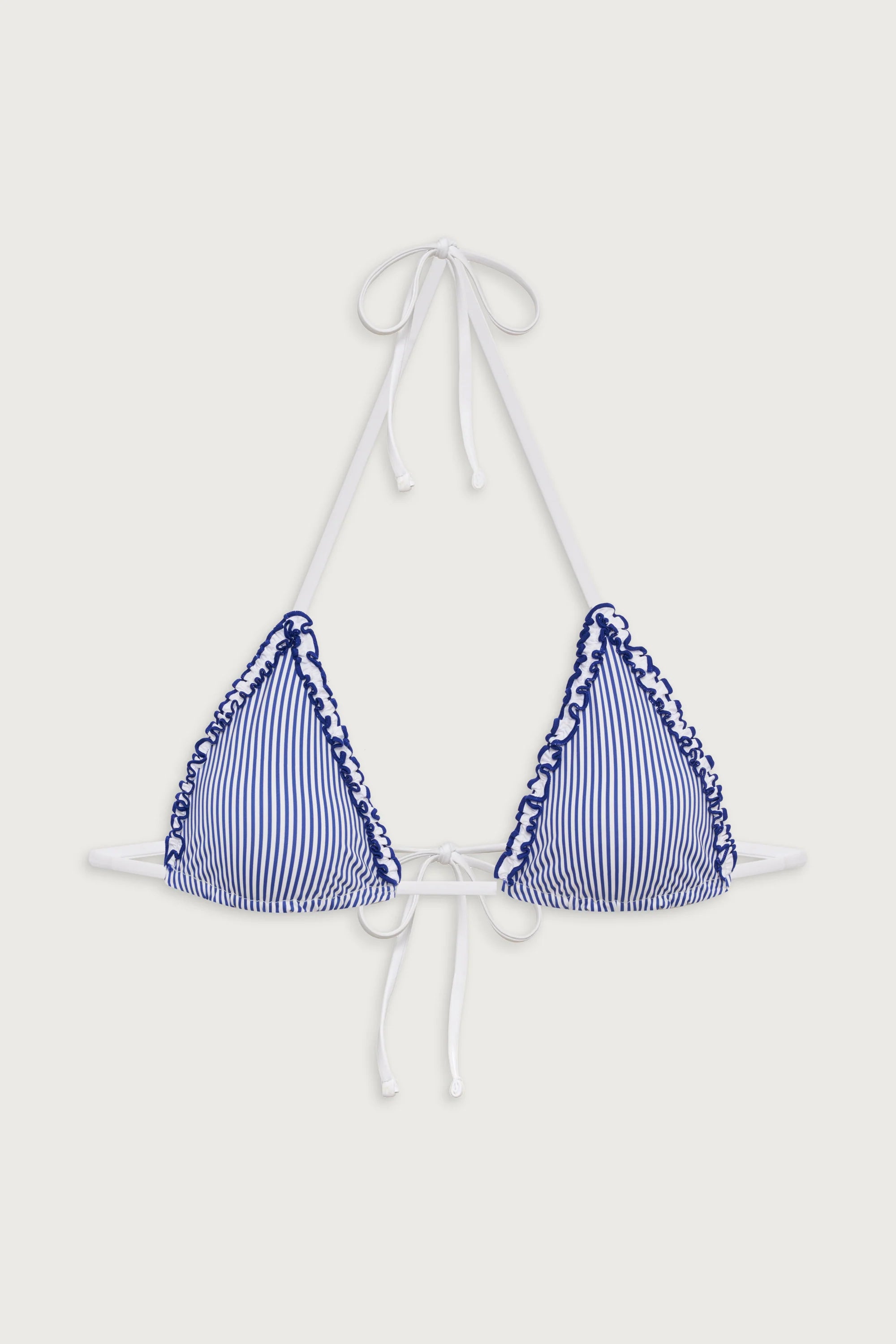 The Nick bikini top features a skimpy triangle shape, our new nautical striped print, and adjustable string ties that wrap around the neck and back to give you a custom fit. Pair this ruffle bikini top with the matching Divine bikini bottom as the perfect tanning set.