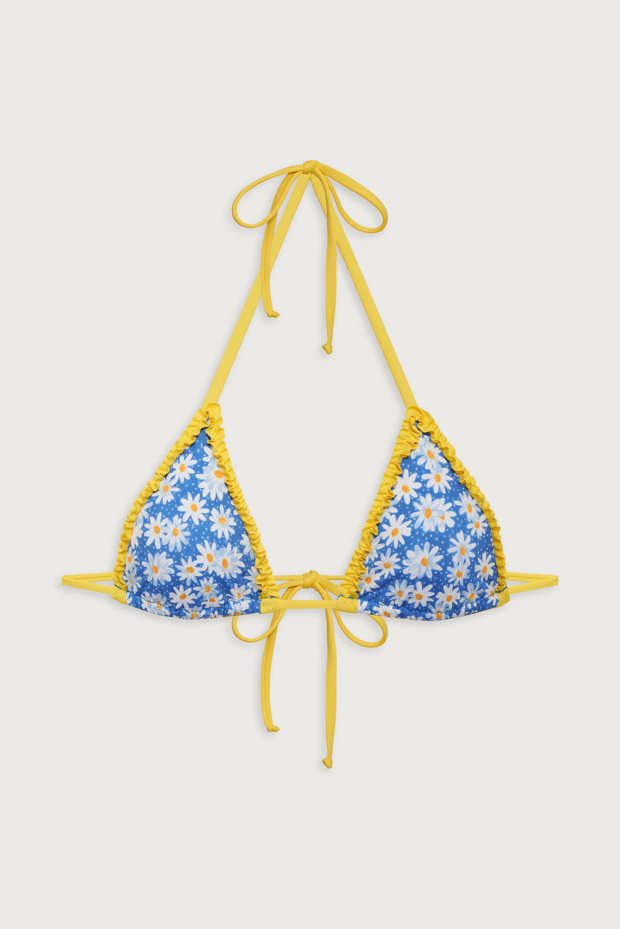 The ultimate bikini top designed in a new floral print, Blue Daisy. Nick features a skimpy triangle shape, ruffle trim, and adjustable string straps that tie around the neck and back to give you a custom fit. Pair the Nick halter bikini top with the matching Divine bikini bottom as your perfect tanning set.
