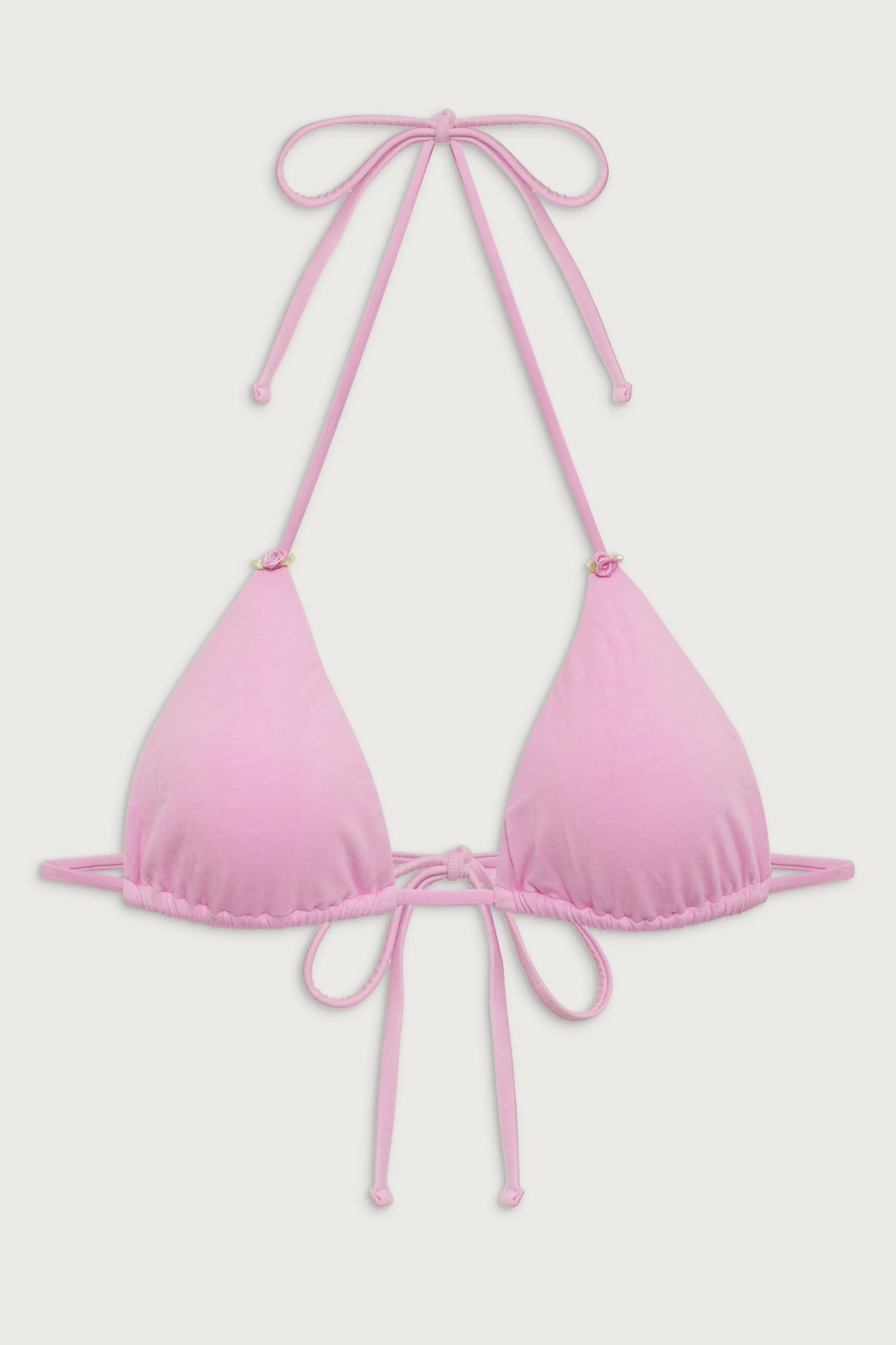 The ultimate bikini top designed in our new French Rose color-way. Nick features dainty rosette details, a skimpy triangle shape, and adjustable halter ties to give you a custom fit. Pair the Nick bikini top with the matching Divine bottom as the perfect tanning set.