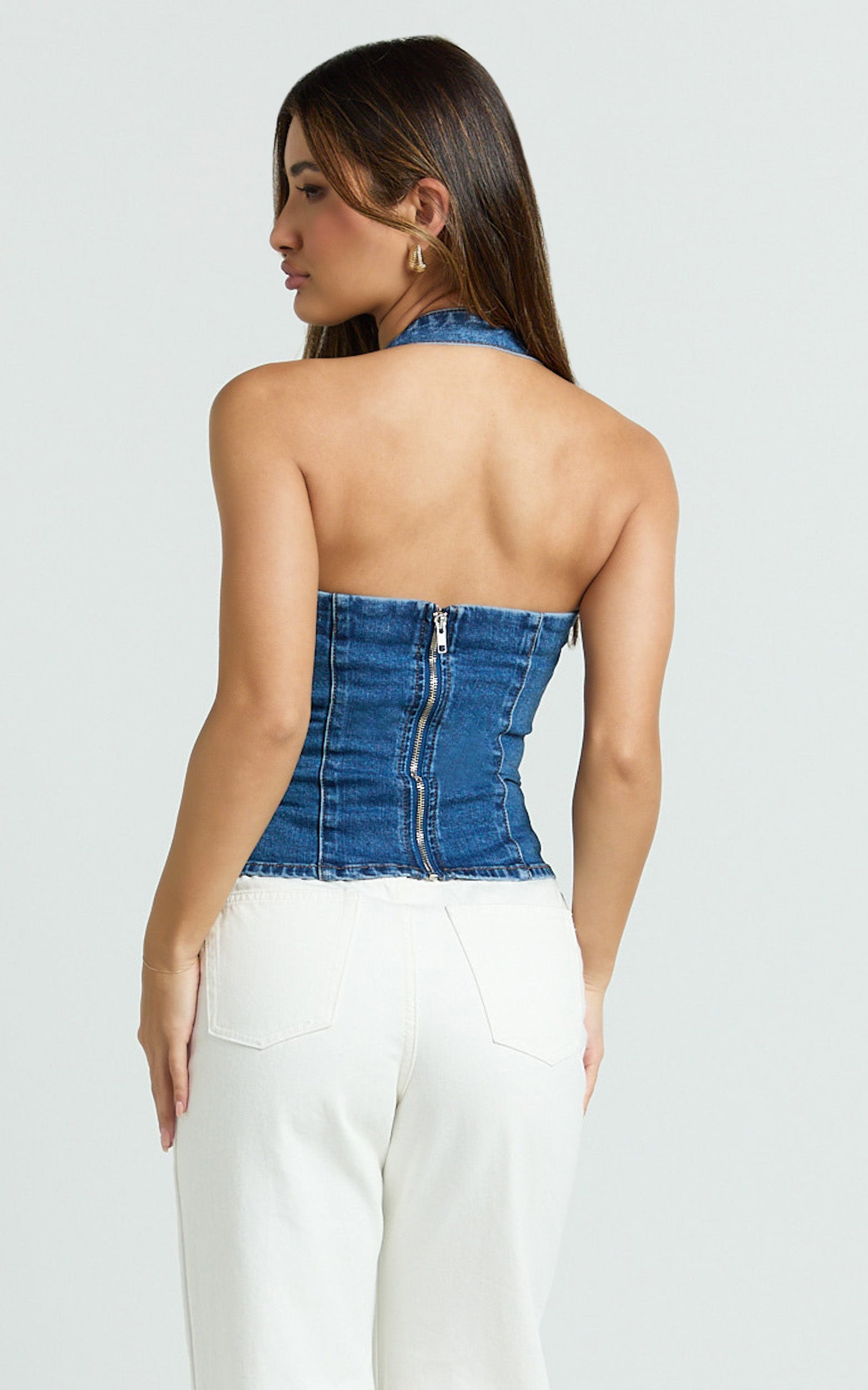 Nicky Top - Denim Hardware Buckle Halter Neck Top In Dark Blue Wash is your shortcut to cool-girl polish. Style it with micro shorts for a legs-for-days vibe or layer under an oversized shirt for that effortless, undone finish. Add statement jewellery to amplify the hardware moment and you’re set. Trending now, this pairs seamlessly with fashion’s love of naked dressing, hinting skin without giving it all away.