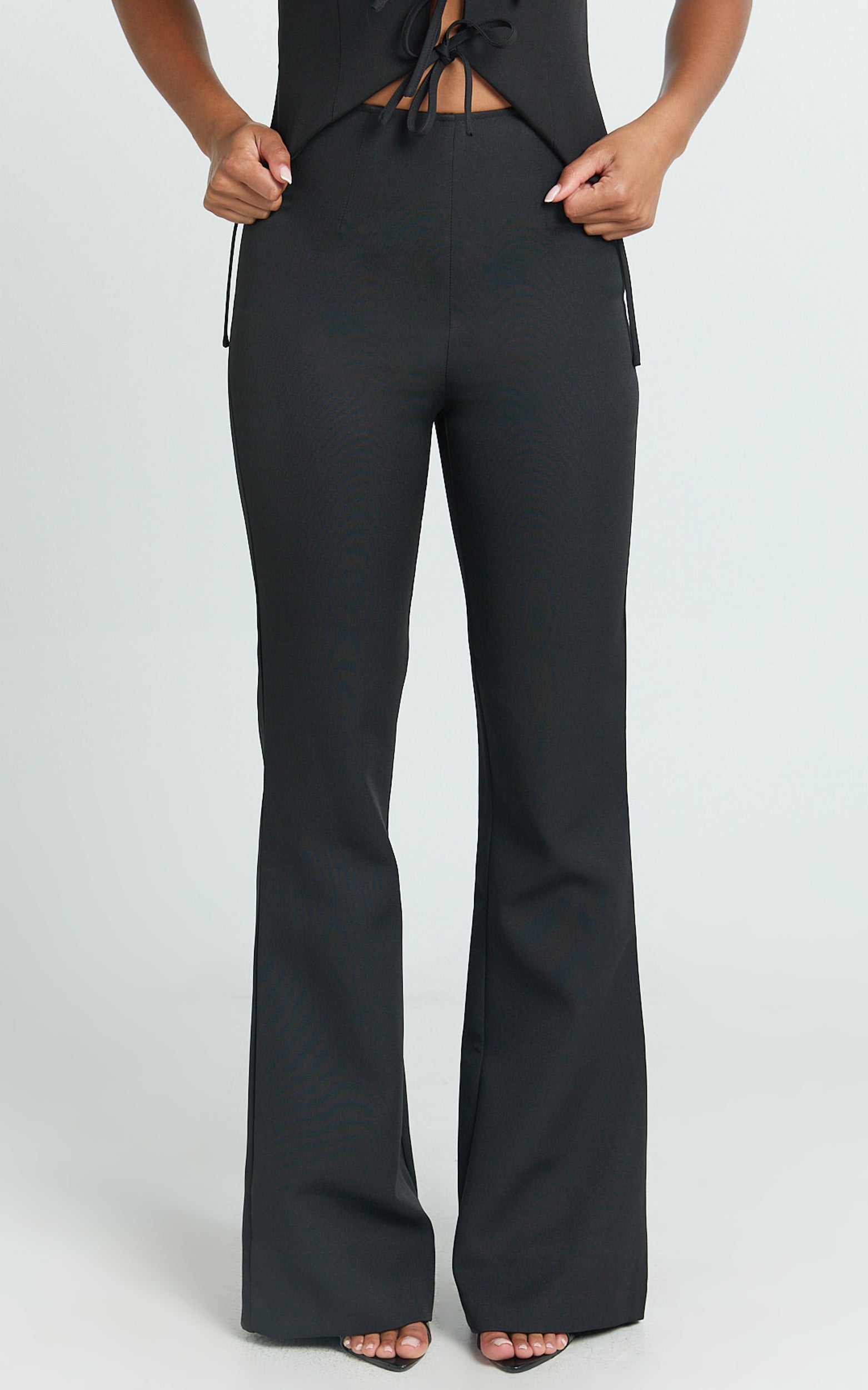 Nola Pants - Mid Waisted Pleated Flare Pants In Black elevate every outfit moment, think desk, date, and everything in between. Their flattering mid rise and flawless black finish make them a forever rotation piece. Dress them up with Patent-Leather Pumps or keep it cool with Minimalist Sandals; add a Belted Tote to complete the vibe. Classic, refined, and ready for repeat wear.