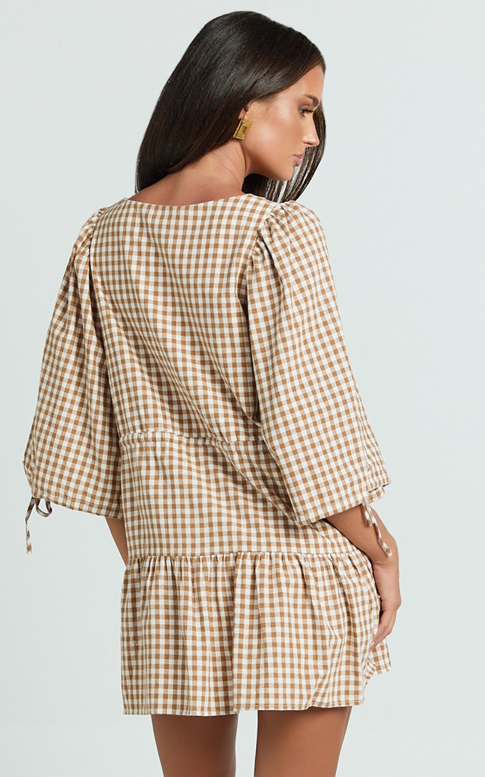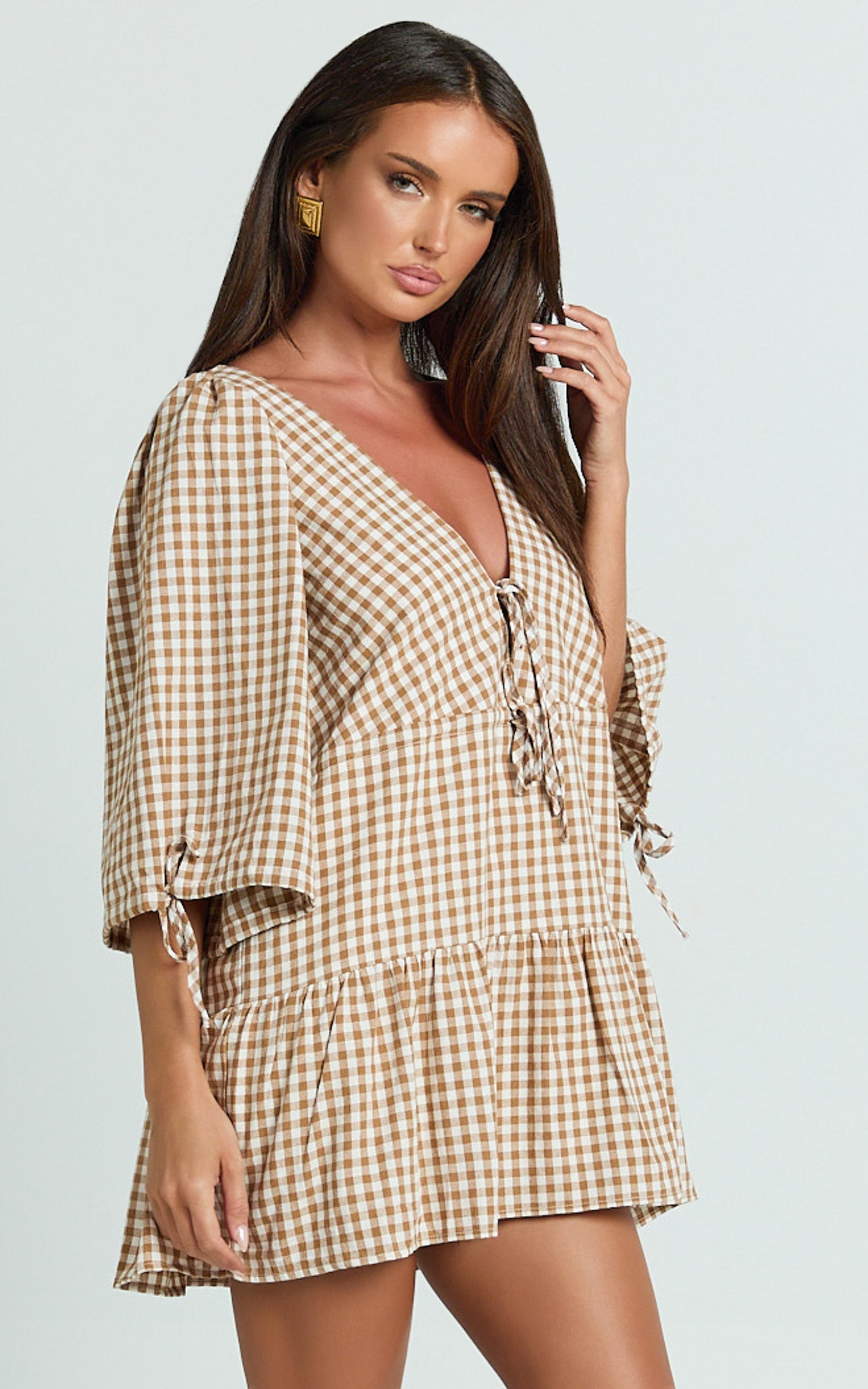 Nour Mini Dress - High Neck Tie Front Drop Waist Gathered Skirt Dress In Caramel/White Gingham nails that Vintage-inspired vibe with a Versatile twist, dress it up with sleek hoops and strappy heels or keep it low-key with chunky sandals and a cute shoulder bag. The caramel-and-white palette slots neatly into your rotation of Dresses, making this brown moment your new go-to.
