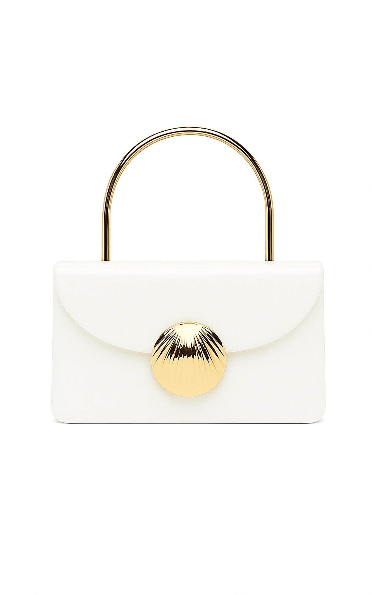 This petite piece doubles as an elegant clutch bag, delivering polished polish for weddings, date nights and everything after-dark. The structured shell silhouette and glossy pearl finish serve Statement Accessories energy, minimal effort, maximum impact, while the top handle makes it easy to tote from cocktails to car-to-curb.