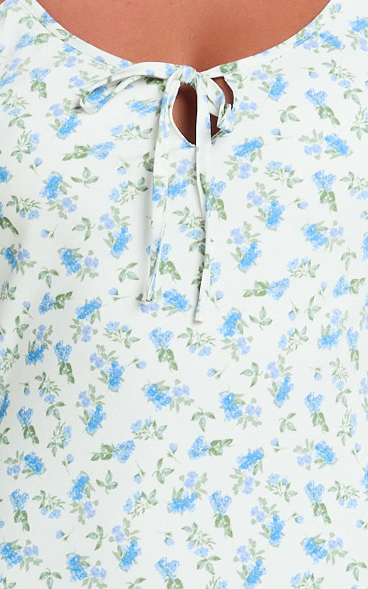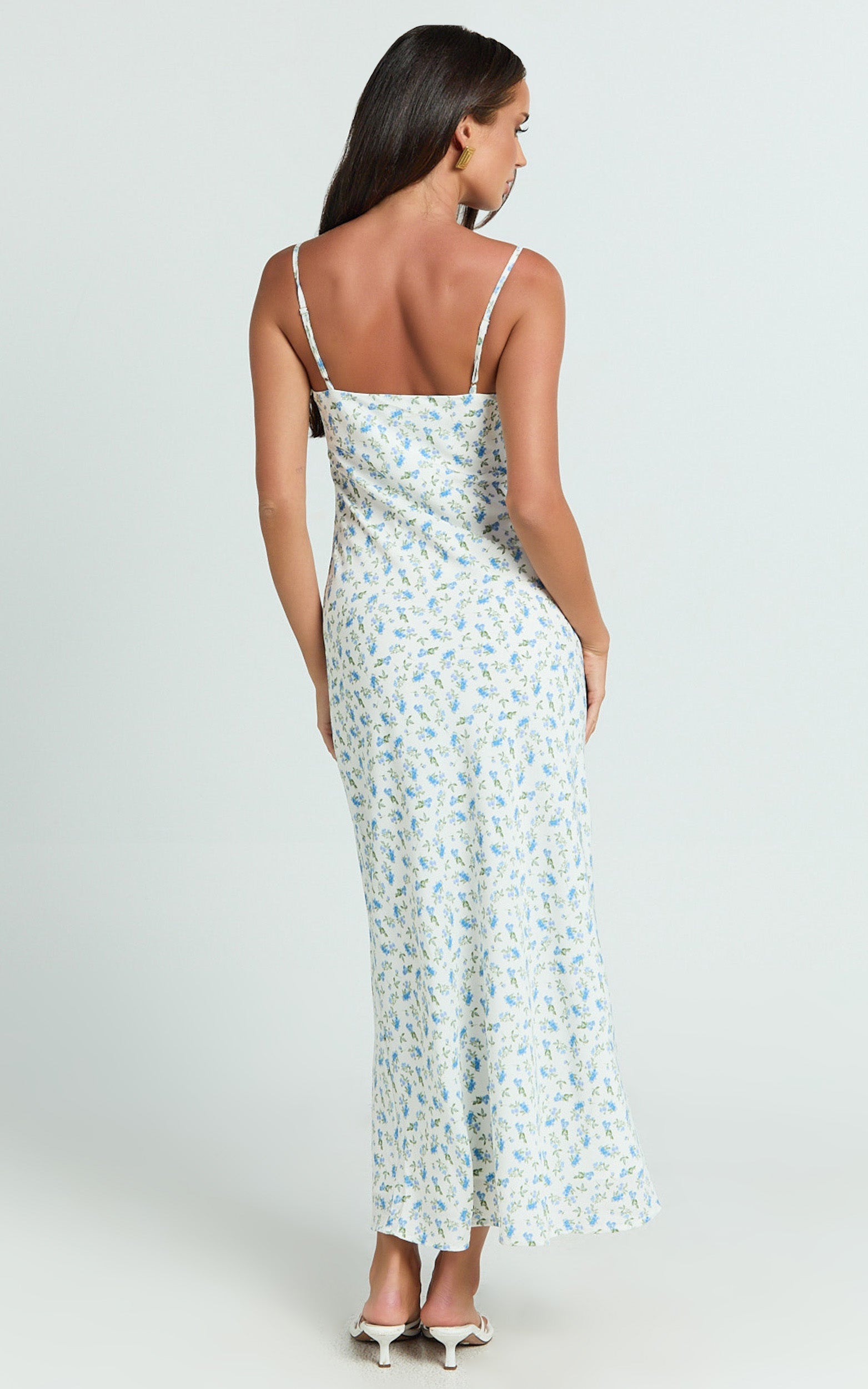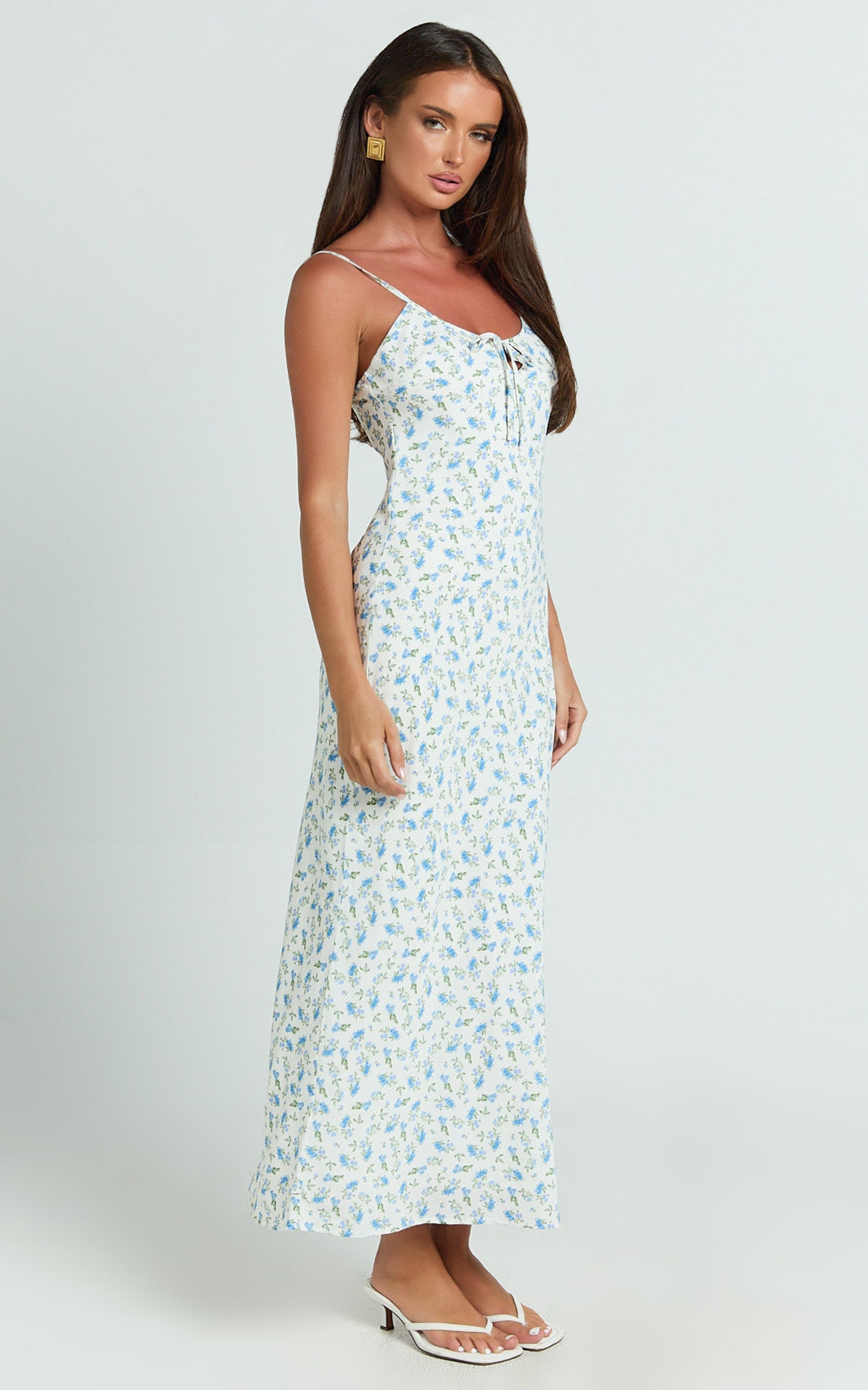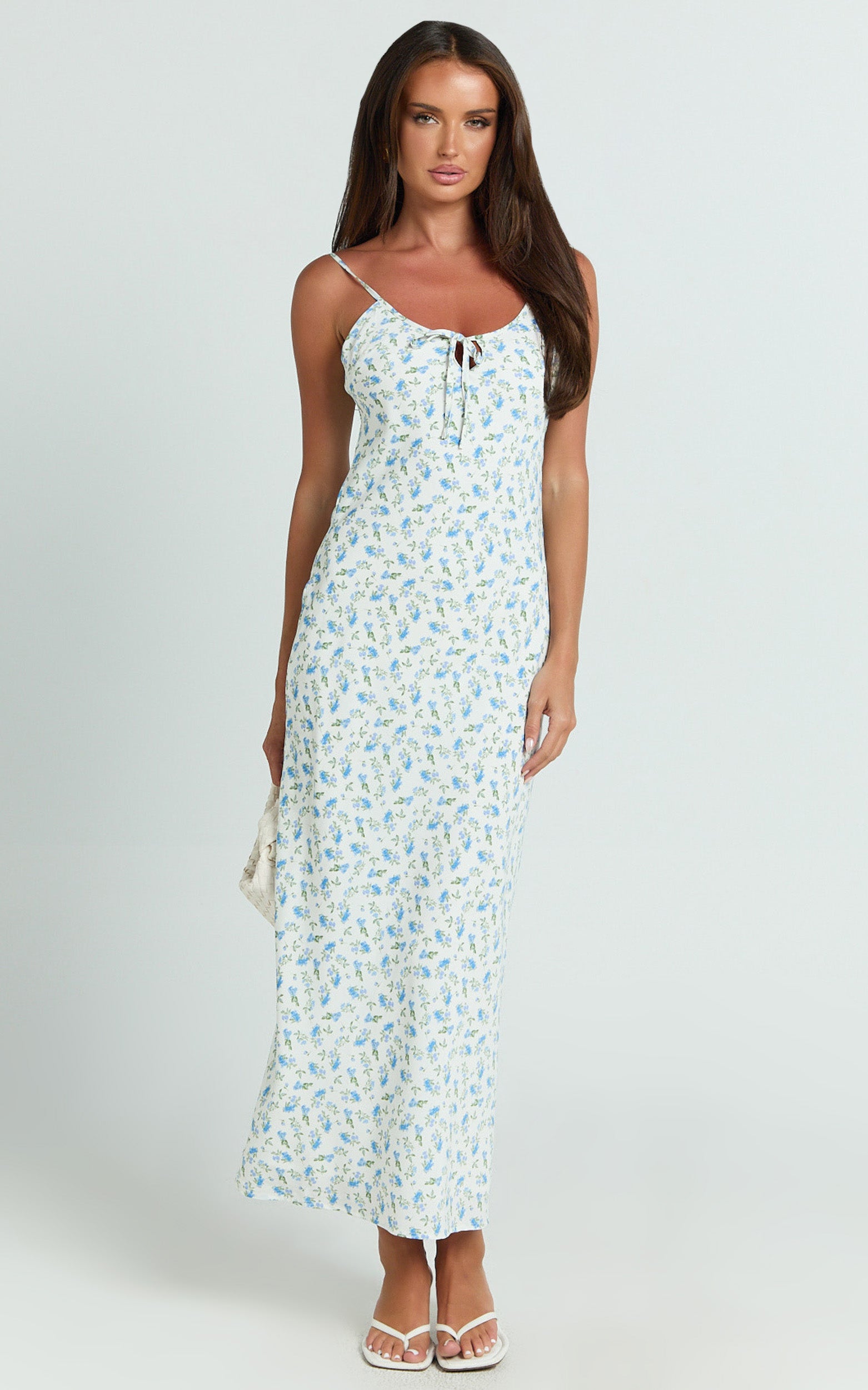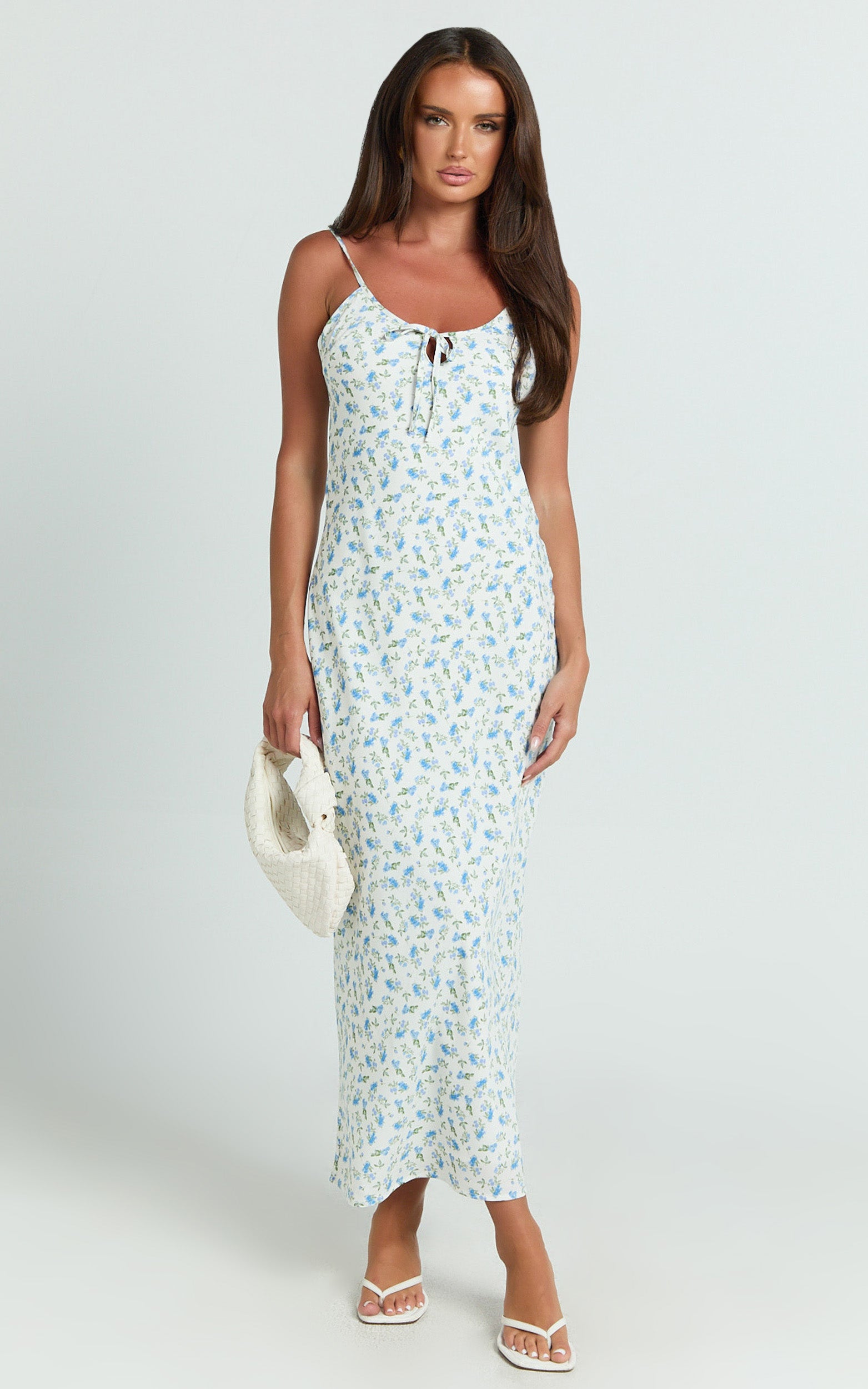 This strappy scoop-neck beauty cinches with a tie-front and falls into a swishy bias skirt that skims and flows in all the right places. The blue ditsy floral pops against white for a fresh, feminine vibe that’s equal parts Minimalist and Statement, perfect for garden parties, long lunches, and everything in between.