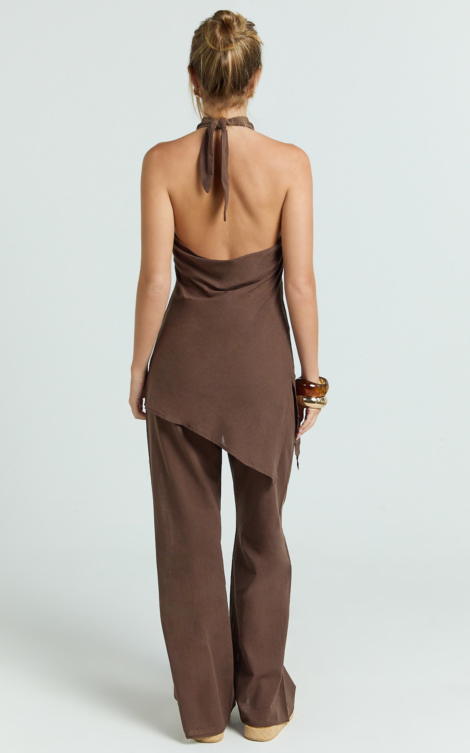 Style the Paige Two Piece Set - Halter Top And Wide Leg Pant Set In Chocolate with minimal heels and a chic shoulder bag for an elevated night look, or swap in white sneakers for day plans. The high-rise wide leg balances the halter neckline for a streamlined fit, while the co-ordinated cut keeps it effortless, wear together for instant polish or mix the top with Summer whites and the pants with Breezy dresses-inspired layers for endless outfit mileage.