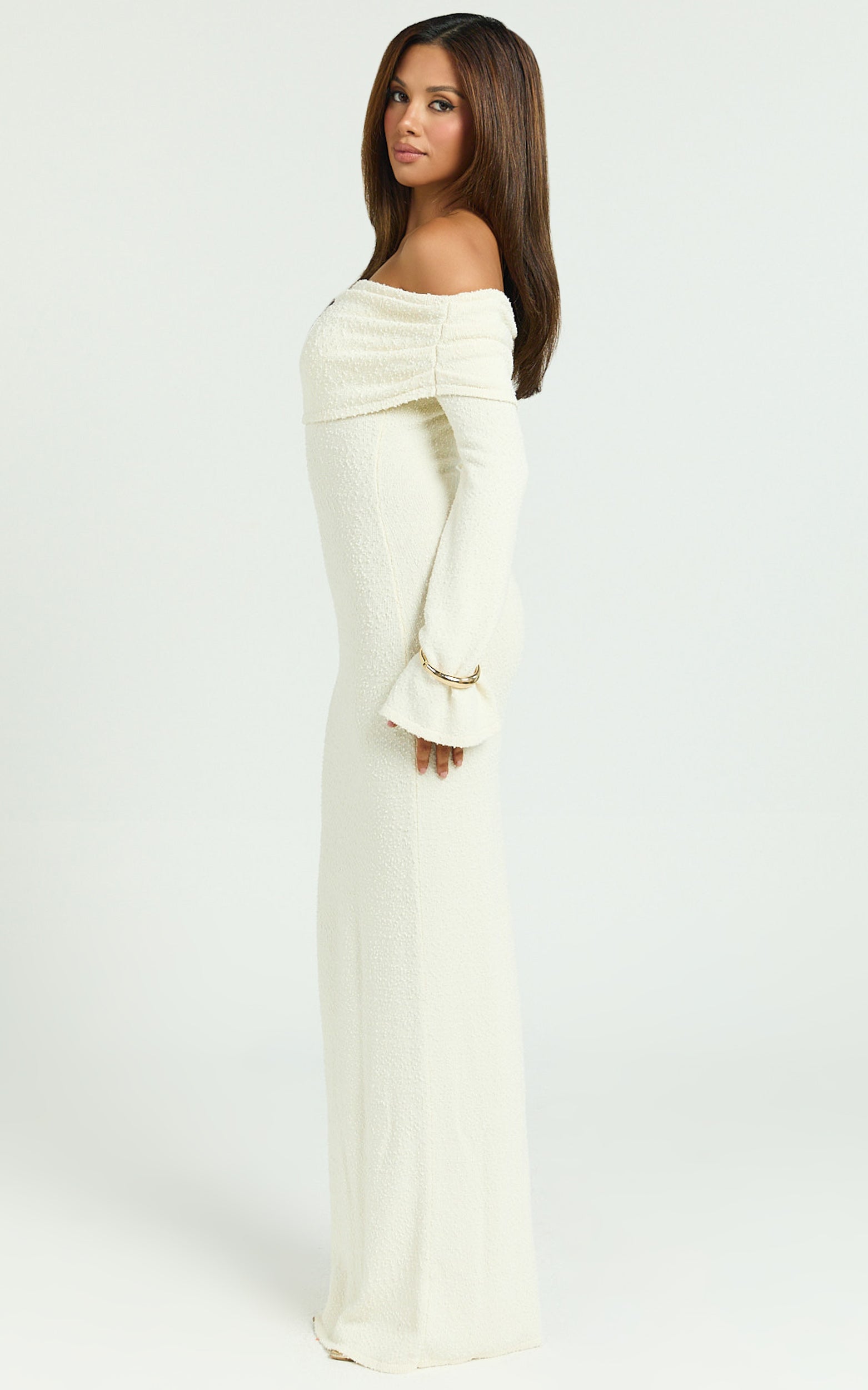 This dreamy cream off-shoulder maxi flawlessly blends vintage-inspired charm with modern sophistication, featuring a figure-skimming silhouette and chic knit texture that flatters your curves in all the right ways. Whether you're heading out to brunch or dancing under the stars, its versatile style makes looking your best feel easy and natural.