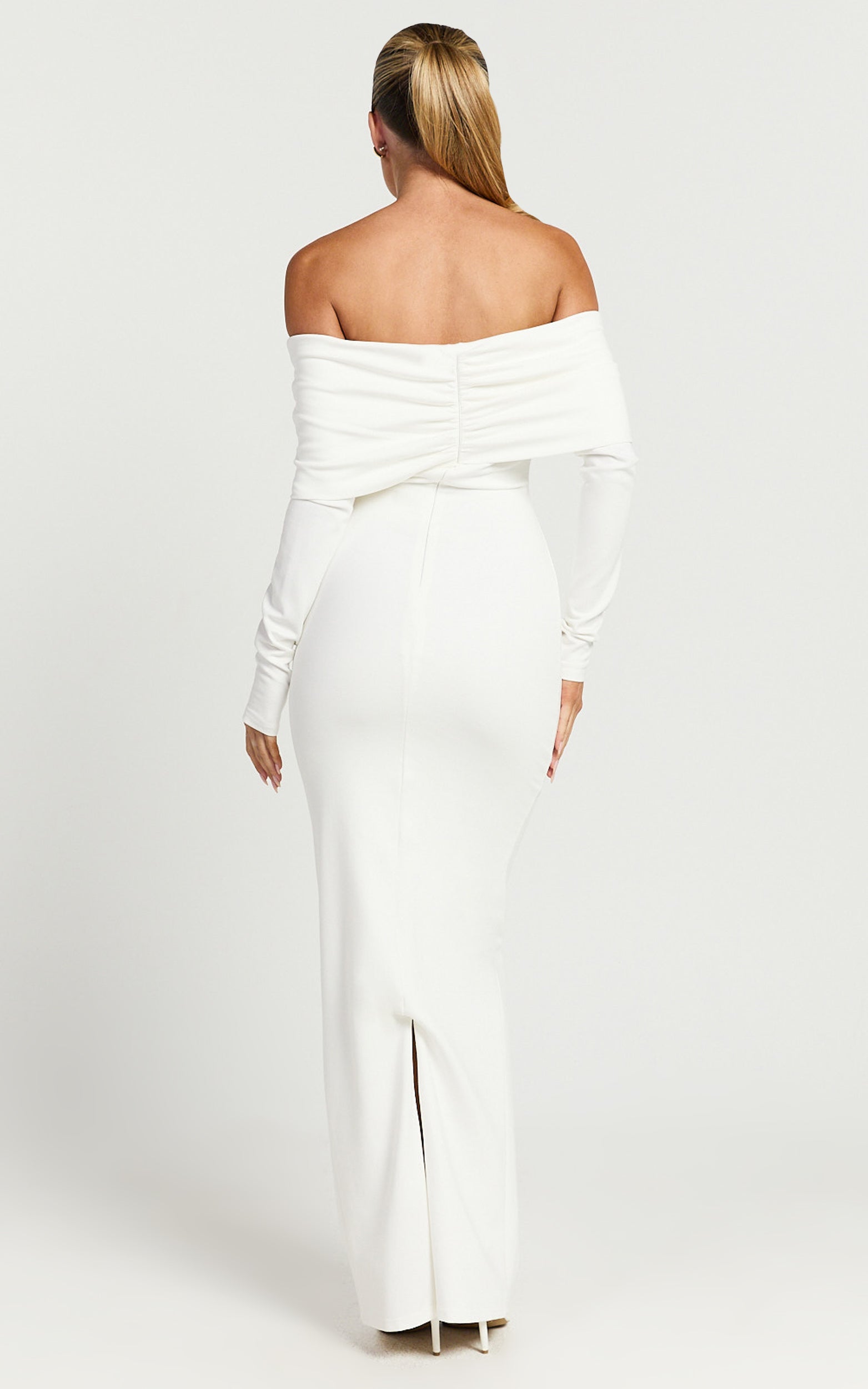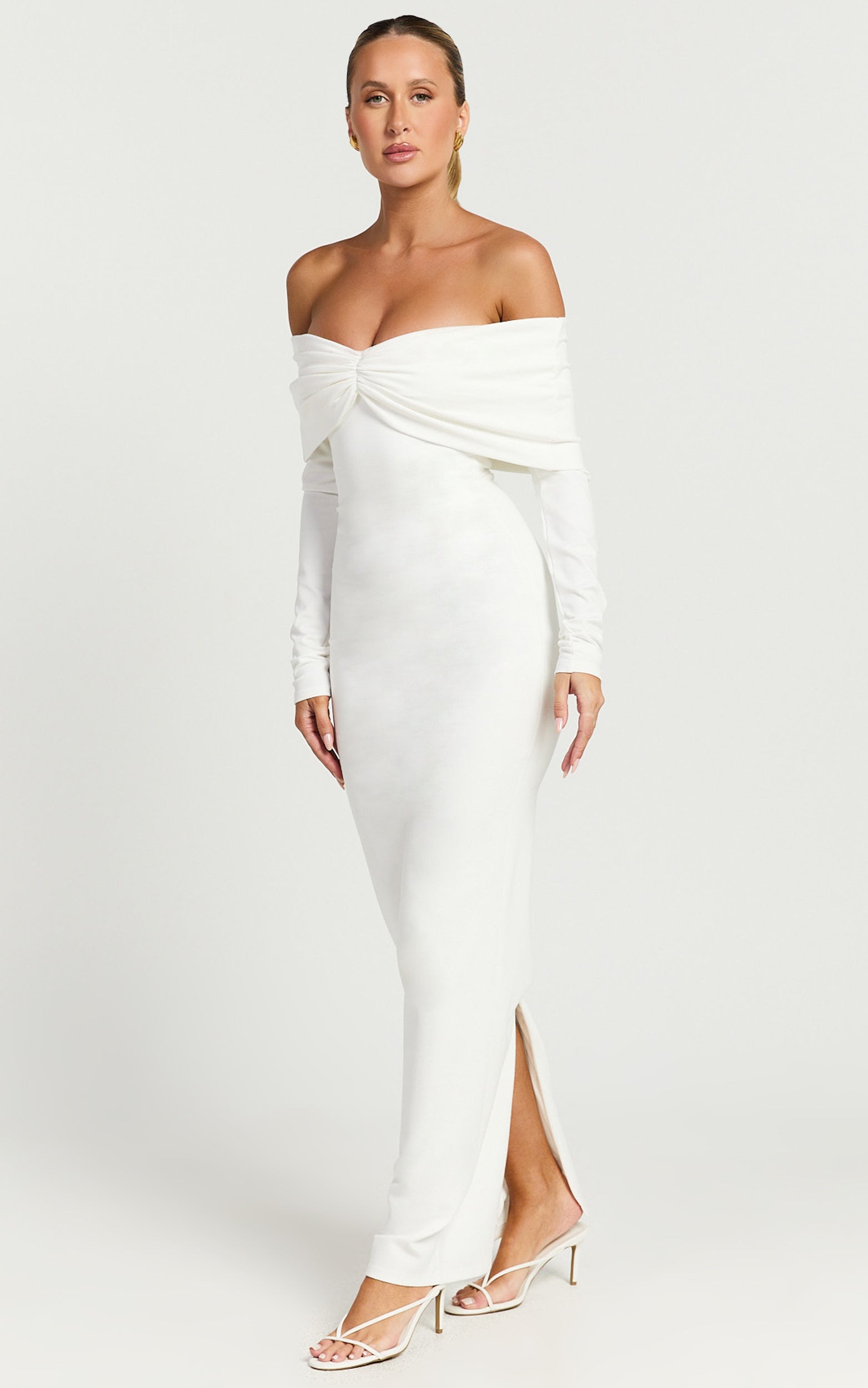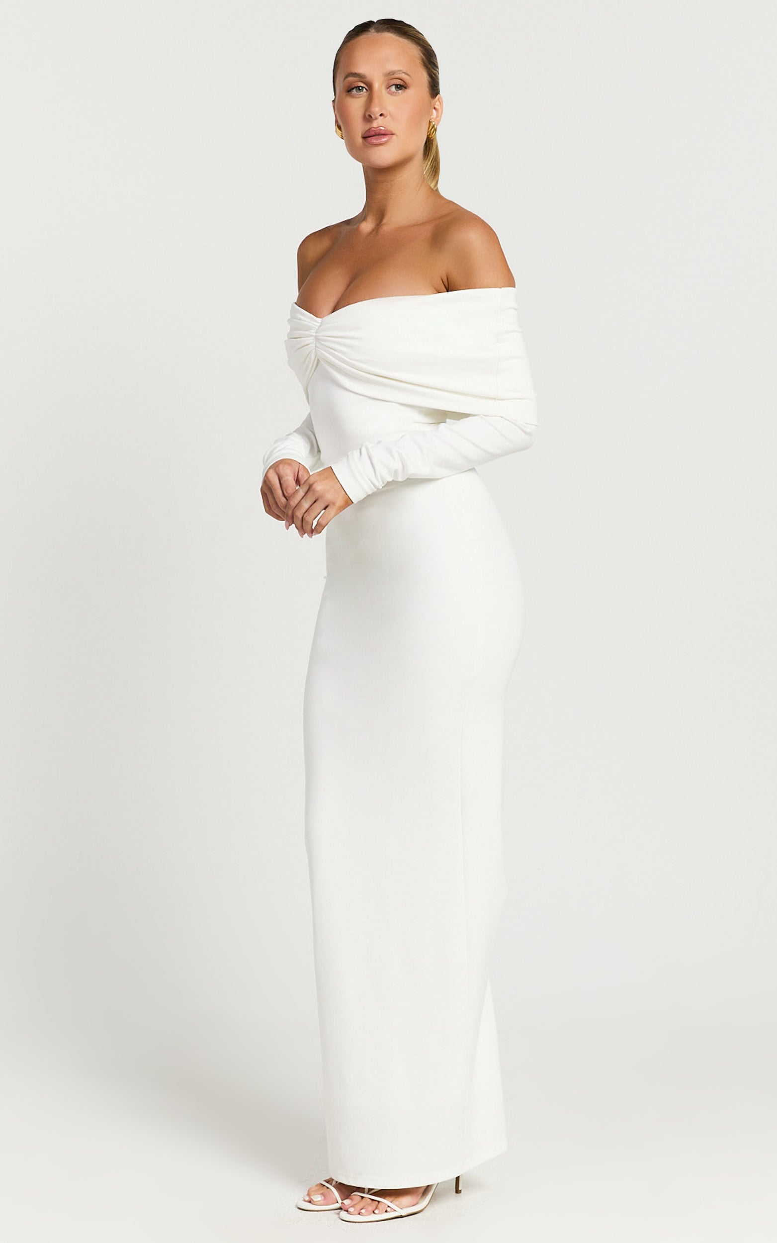 Designed with a sleek, curve-hugging bodycon silhouette, this long-sleeved white dress features an off-shoulder neckline, blending minimalist charm with runway sophistication. Perfect for everything from sultry date nights to glamorous events, it's a versatile standout in any wardrobe.