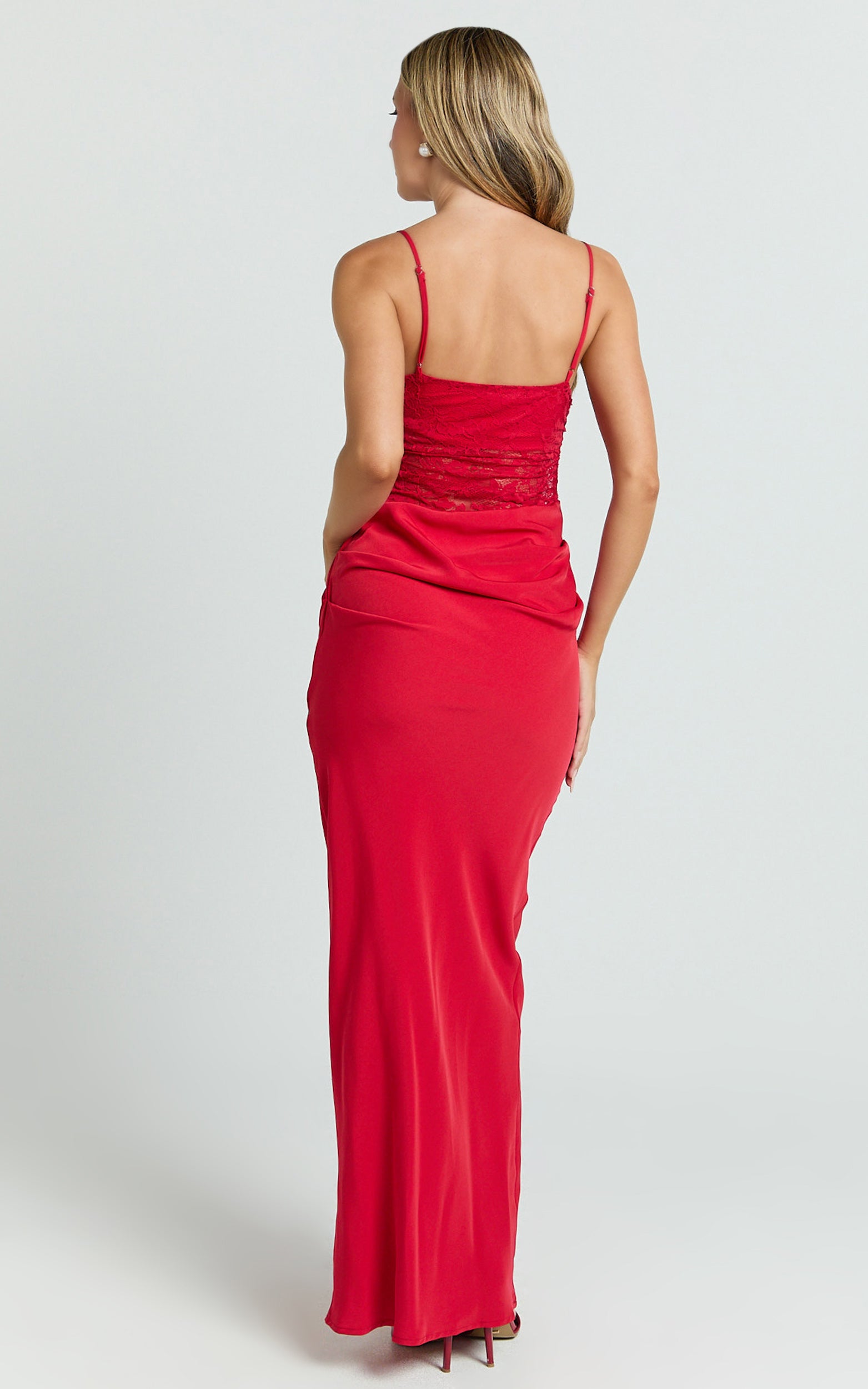 This red maxi brings a contrast lace bodice, cowl detail and drop waist that hugs in all the right places, think elevated Dresses energy with a hint of naked dressing allure. Perfect for dinners, date nights and dance floors, the movement is fluid, the vibe is bold, and the finish is photo-ready.