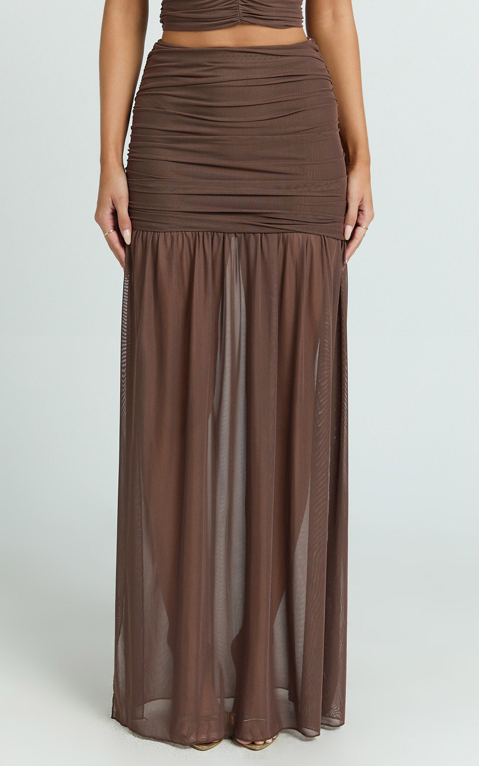 Transform your look with the Ray Maxi Skirt - a chic and playful addition to your wardrobe that's perfect for any fashion-forward Gen Z or Millennial. This mesh ruched side-split maxi skirt comes in a delicious chocolate hue that creates an irresistibly sultry silhouette, making it a must-have for parties and beyond.