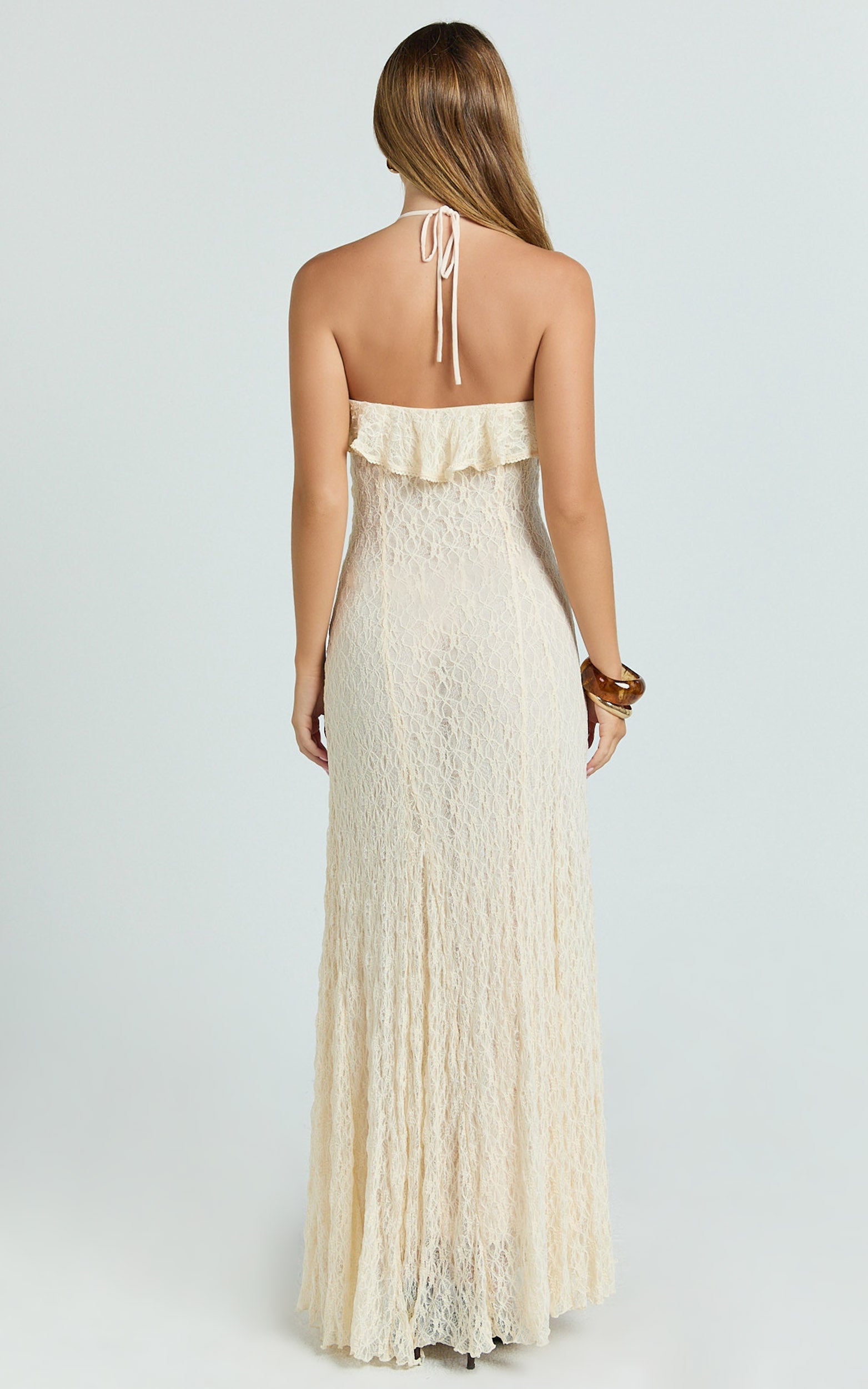 The Rhea Maxi Dress in Cream features a halter neckline, lace ruffles, and an A-line godet skirt that creates a swishy, waist-snatching silhouette, moving beautifully from ceremony to cocktails. Softly sculpting and ultra-flattering, it’s the piece you’ll reach for when the dress code calls for timeless polish with a playful twist. Modern occasionwear made easy, the Rhea Maxi Dress brings delicate detailing and an elegant full-length finish. Style with strappy heels and a minimal clutch for a refined moment, or add subtle contrast with gold pendant necklaces or a statement cuff. With graceful movement and romantic texture, she’s ready for weddings, long lunches, and evening plans that linger.