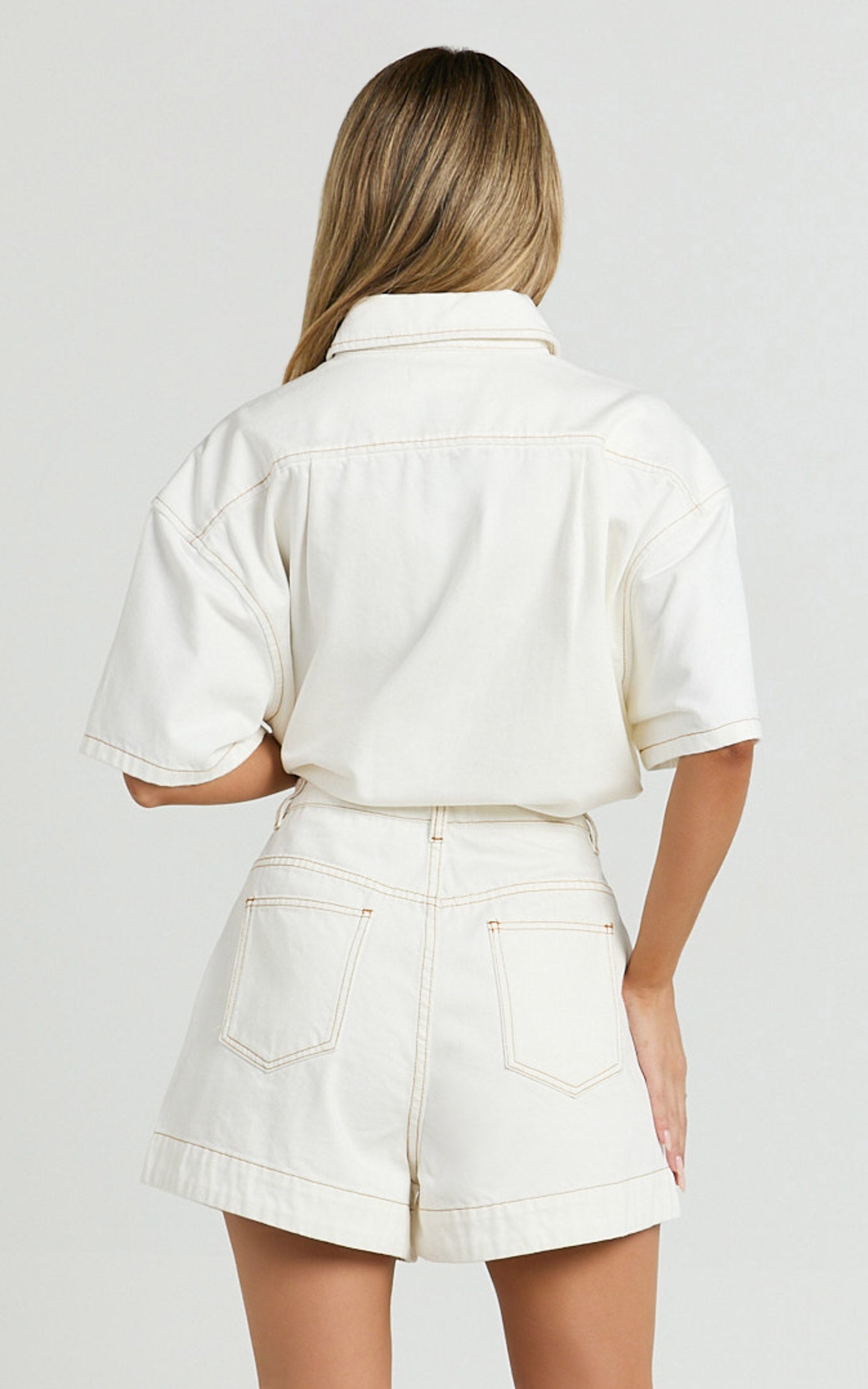 These cream mid-waist Shorts serve clean lines and a flattering leg length, finished with contrast tobacco stitching for that subtle pop. The fit is relaxed but polished, Minimalist in mood, Vintage-inspired in vibe, so they slip into every wardrobe with ease.