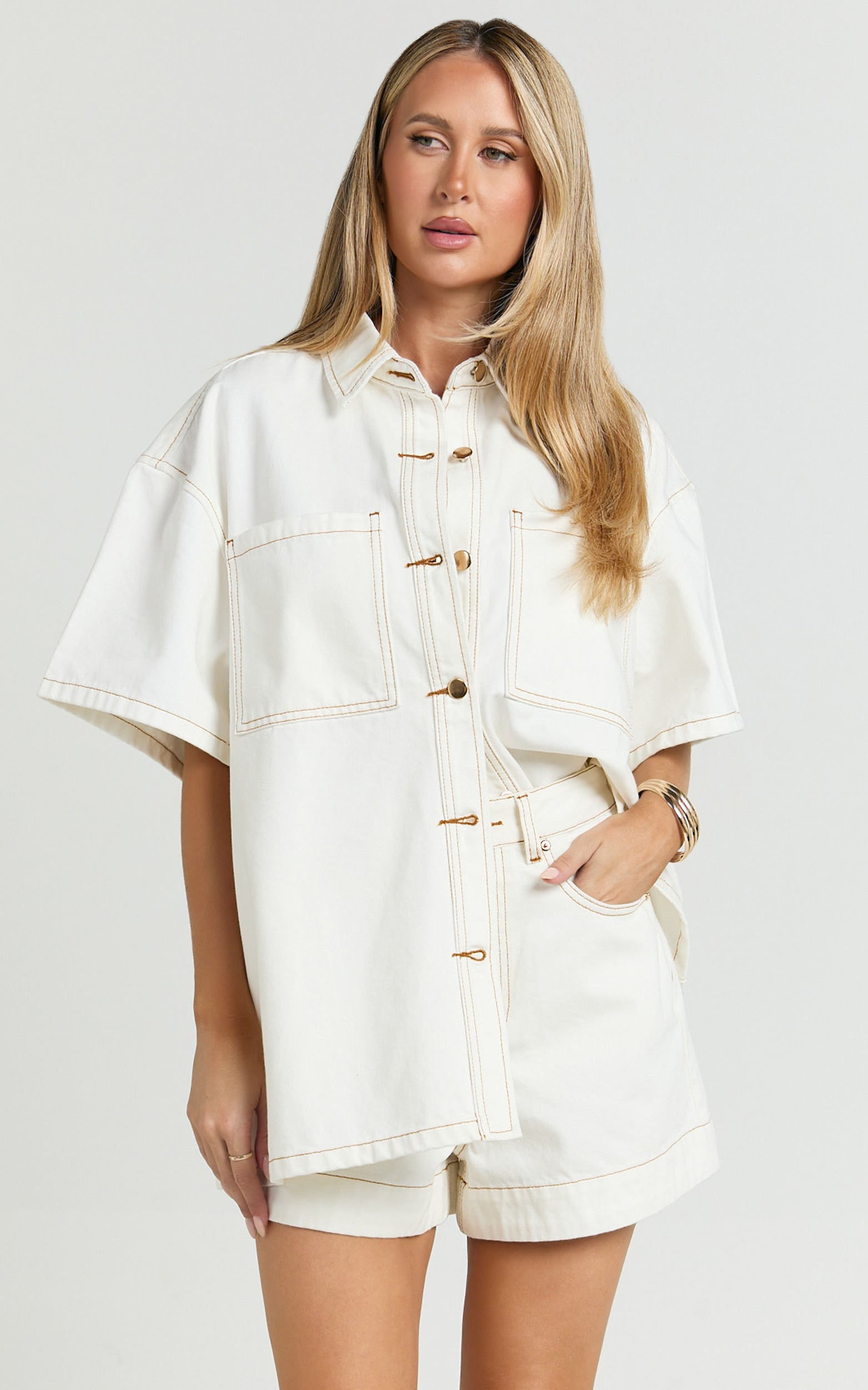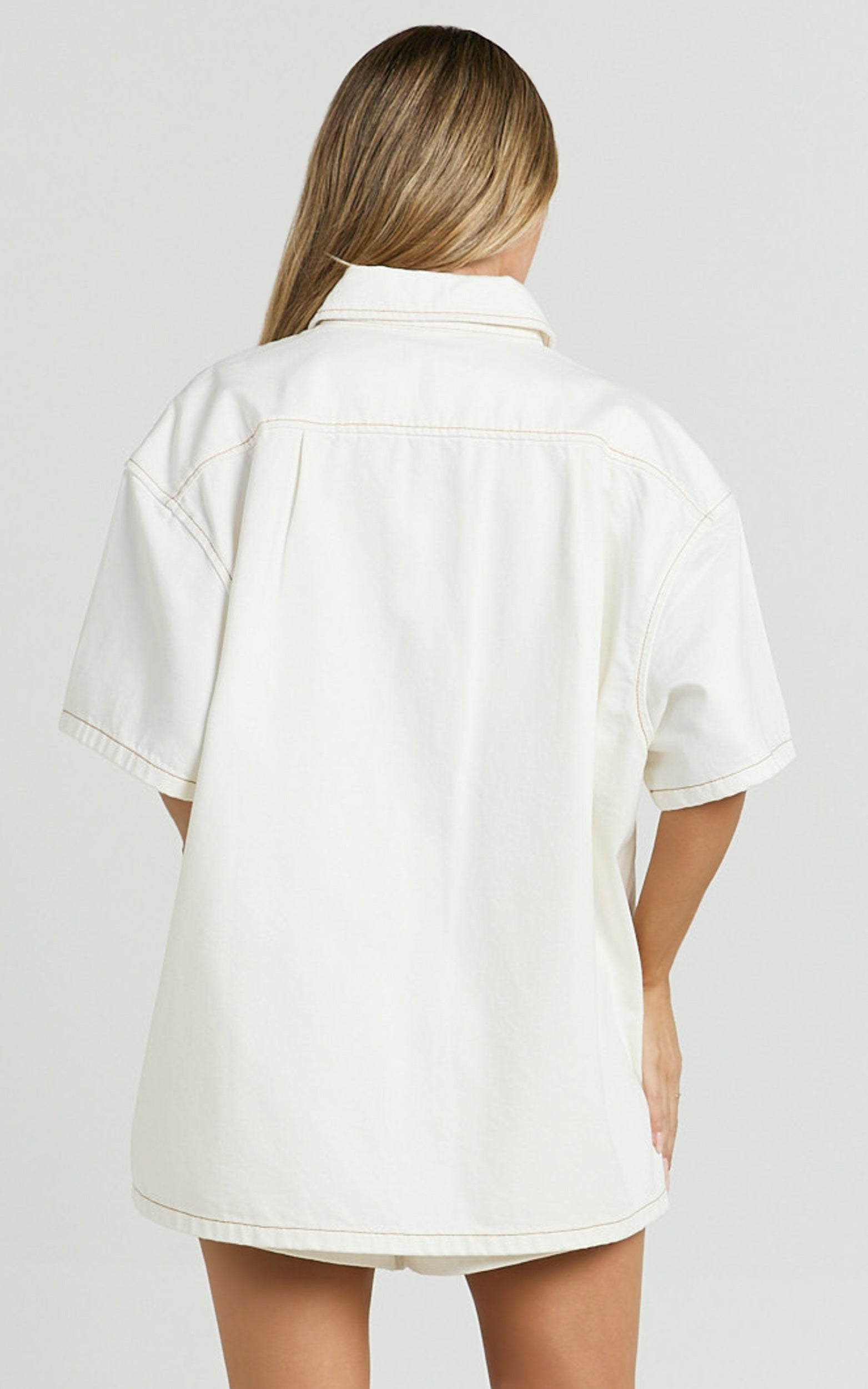 The contrast tobacco stitch and hardware details dial up the attitude, while the relaxed short sleeves keep it effortlessly cool. Tuck it, crop it with a front knot, or wear loose, this top is a timeless staple that goes from desk to dinner without trying too hard. It’s an easy win for your Tops rotation.