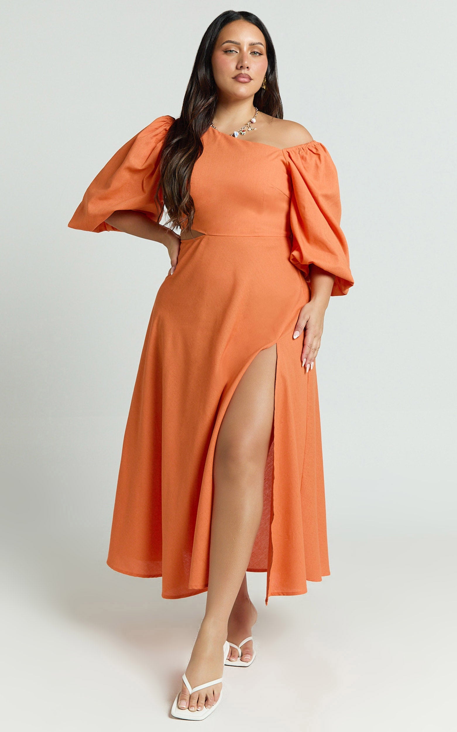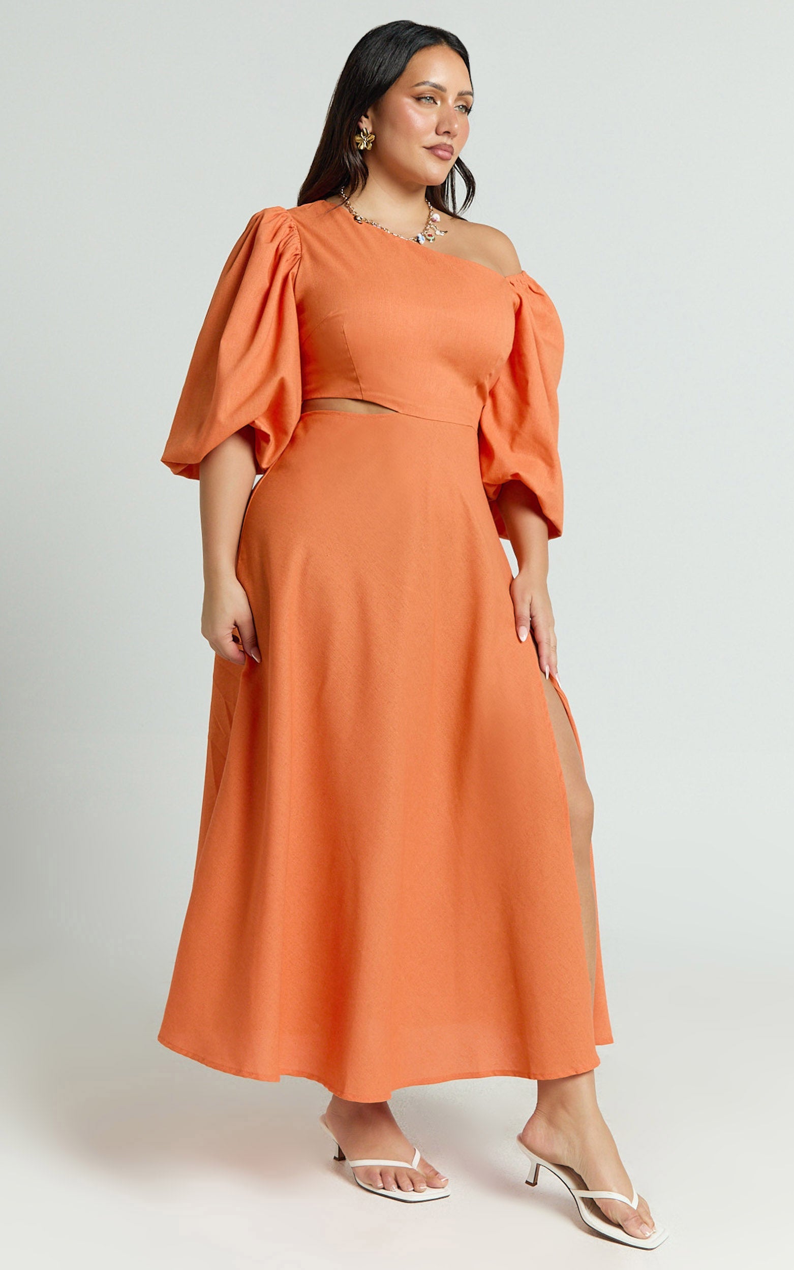 Make a statement in our Rhyne Midi Dress - the perfect blend of feminine charm and contemporary style. This stunning dress features an asymmetrical design with puff sleeves and a side cut-out, adding an edgy touch to its classic A-line silhouette. Crafted from a luxurious blend of cotton and linen, this dress offers both comfort and breathability. Whether you're attending a party or spending the day out with friends, this versatile midi dress is sure to make you feel confident and empowered. Embrace your unique style with our Rhyne Midi Dress in papaya orange – the ultimate choice for fashion-forward women who aren't afraid to stand out from the crowd.