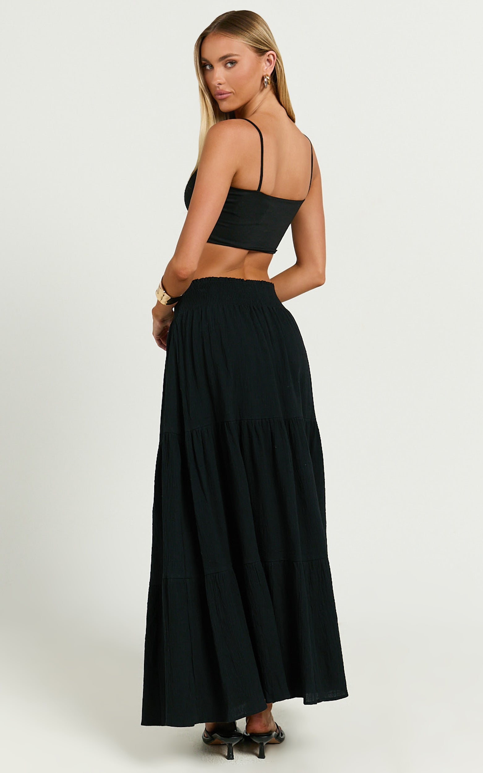 Elevate your style with our Ruby Midi Skirt – the quintessential piece your wardrobe has been longing for. If you're on the hunt for a skirt that seamlessly transitions from a casual weekend vibe to the heart of a party day ensemble, look no further. This Shirred High Waist Cotton Tiered Midi Skirt, in an eternally chic black, is as versatile as it is voguish.