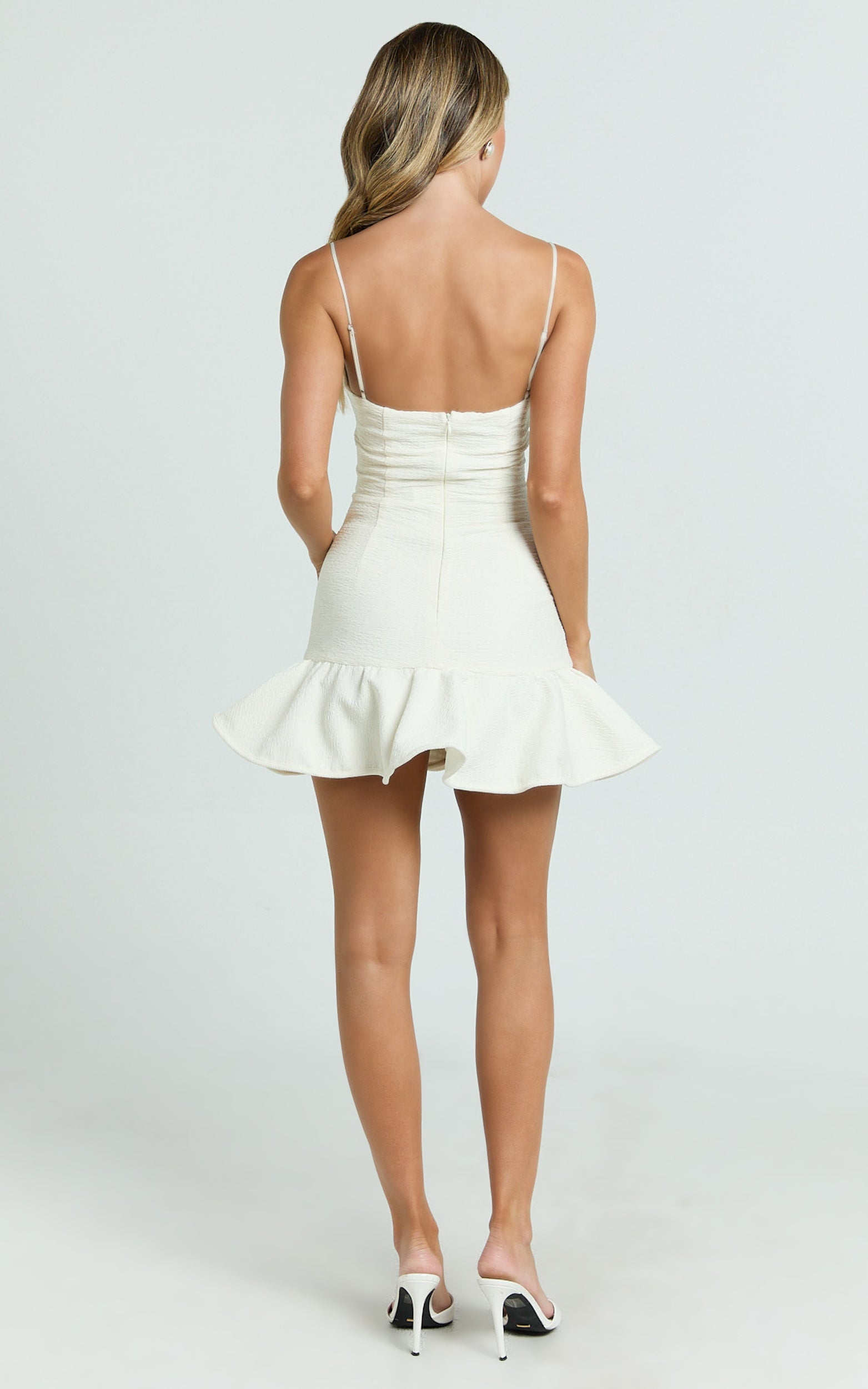 Perfect for parties, dates, or your next night out, this fitted silhouette keeps things chic while the flounce adds movement for every step and twirl. Inspired by the buzz around the naked dress trend and polished styling seen with a skirt suit edge, it taps into the moment while staying timeless in off white.