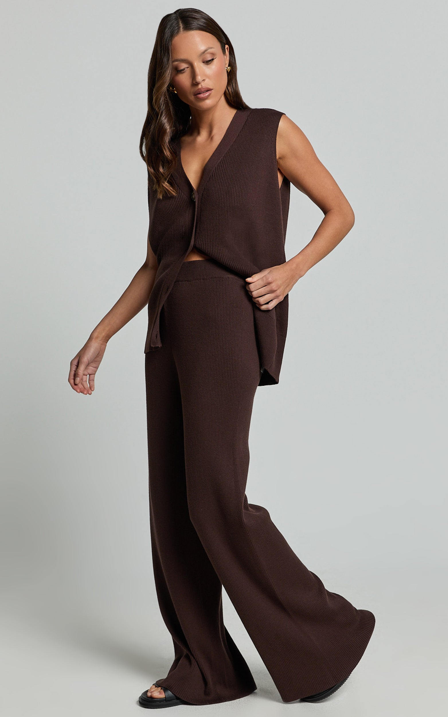 Embrace warmth and undeniable style with our Sasha Pants - the ultimate knitted high waist, wide-leg pants in a luscious chocolate shade that you've been dreaming of. Crafted meticulously from a cozy, fully fashioned knit acrylic, these pants are not just about comfort; they're a statement of your unique style and confidence.