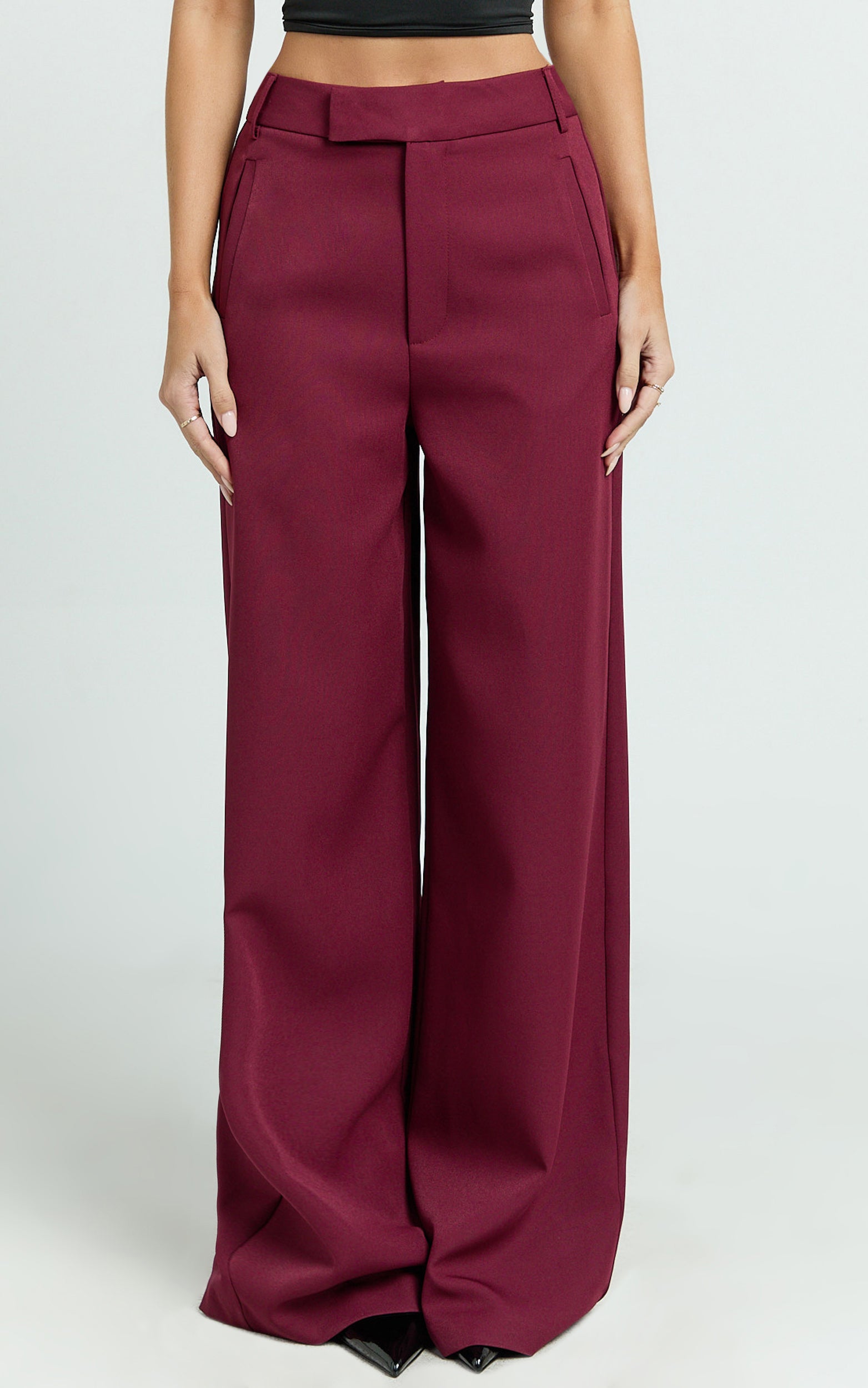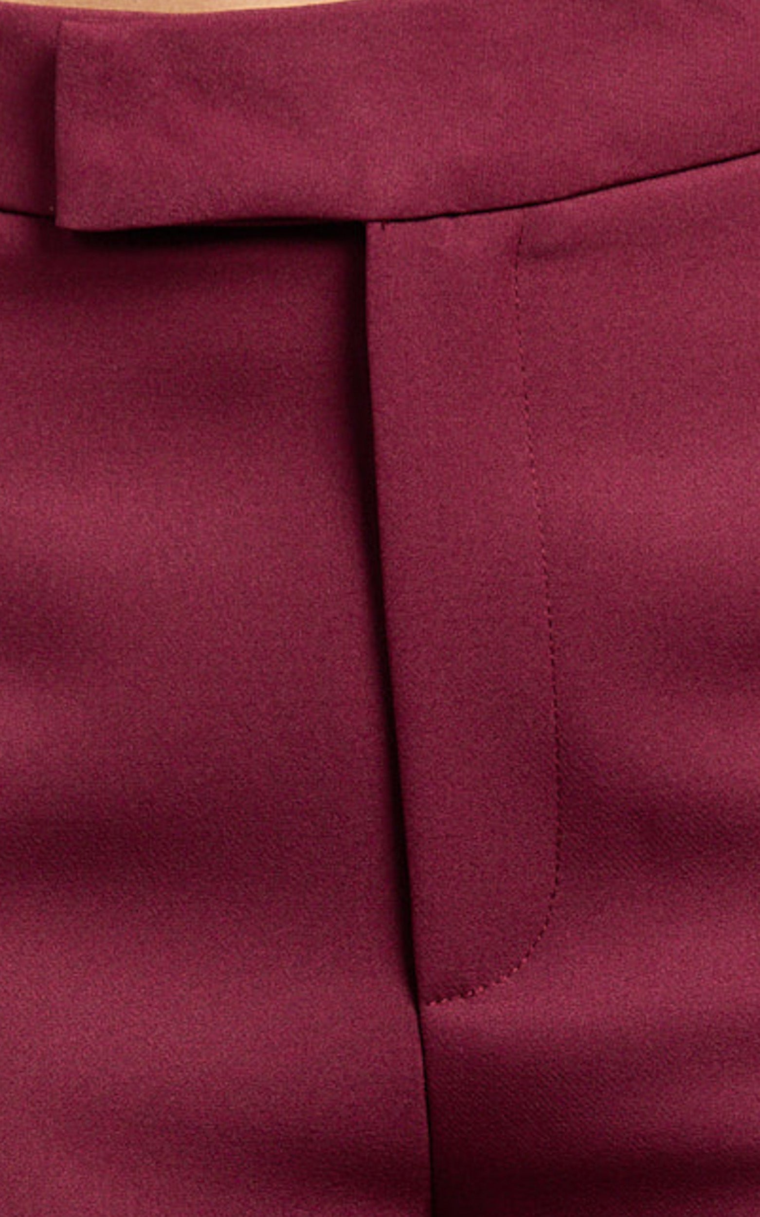 High-waisted and leg-lengthening, these wide leg tailored pants in a rich wine hue deliver instant polish with a relaxed, fluid drape. The silhouette channels Quiet Luxury while leaning into Maximalism with a bold colour pop, perfect for desk to dinner and every RSVP in between.