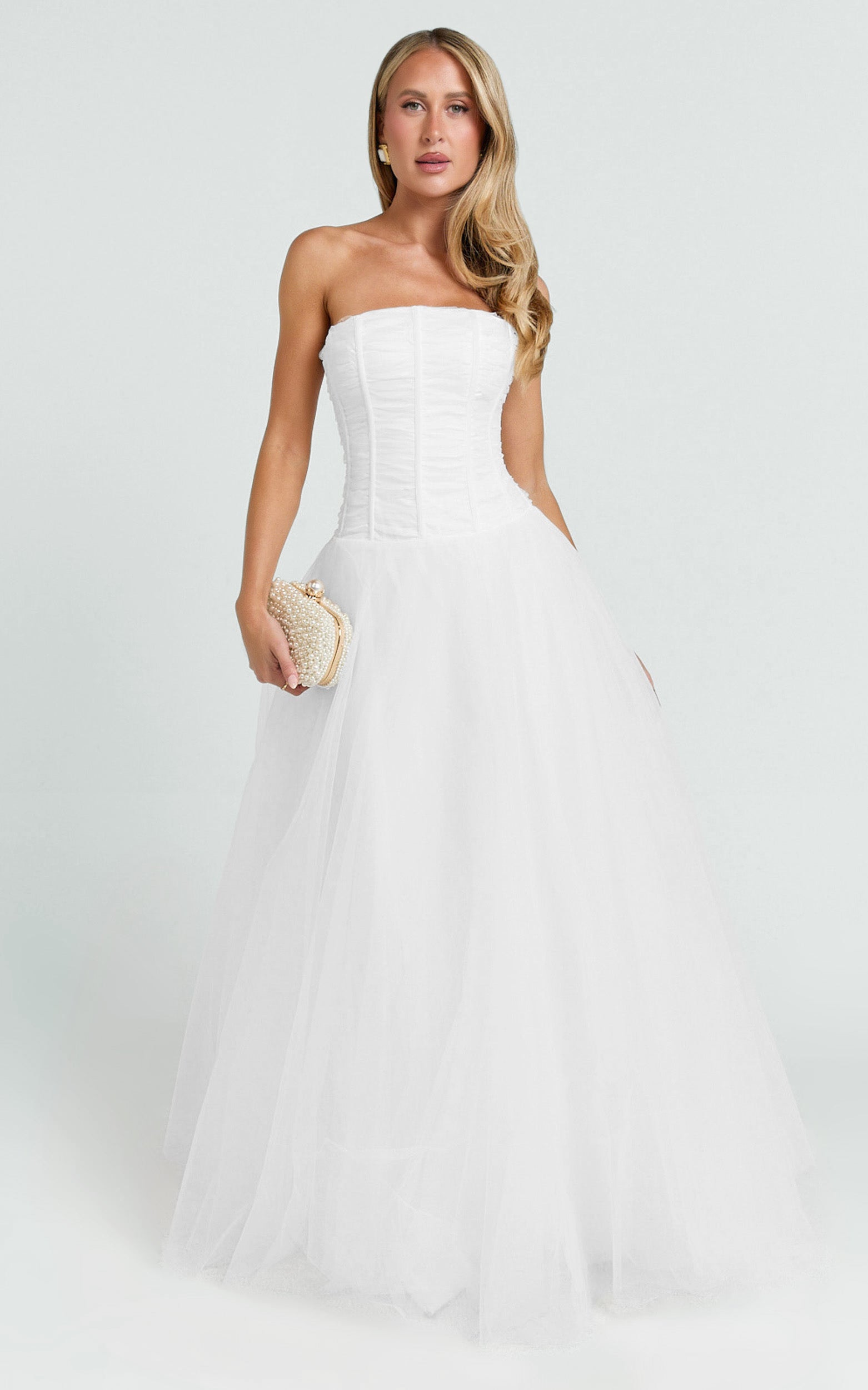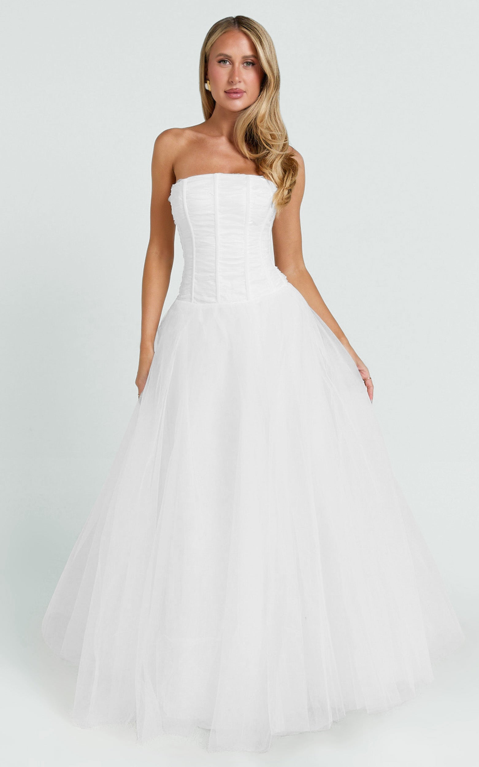This strapless corset maxi shapes and defines, then flows into a softly gathered skirt that moves with you, perfect for brides-to-be, formals, and any moment you want high-impact polish. The white hue feels fresh and ladylike, while the sculpted bodice gives undeniable sex appeal. Consider it your statement piece in the Dresses lineup.