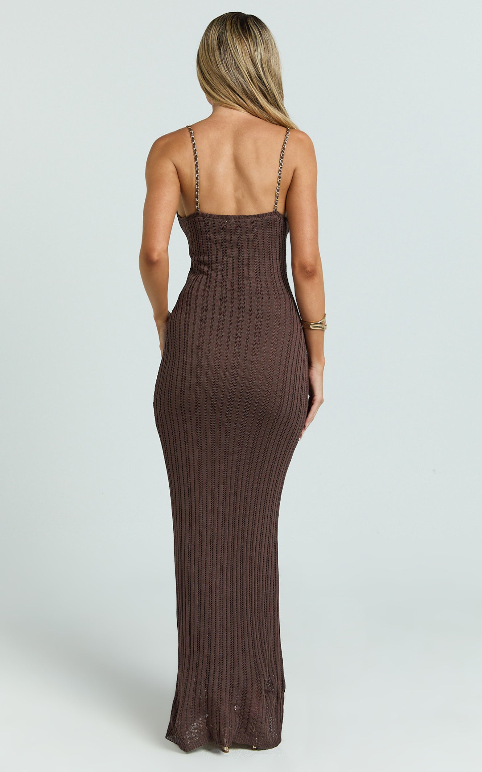 This scoop neck knitted maxi skims your silhouette with a sleek, second-skin fit and statement chain straps that bring just the right amount of high-shine drama. The rich browns hue keeps it chic for day-to-night, while the floor-grazing length serves legs-for-days energy across dresses season.