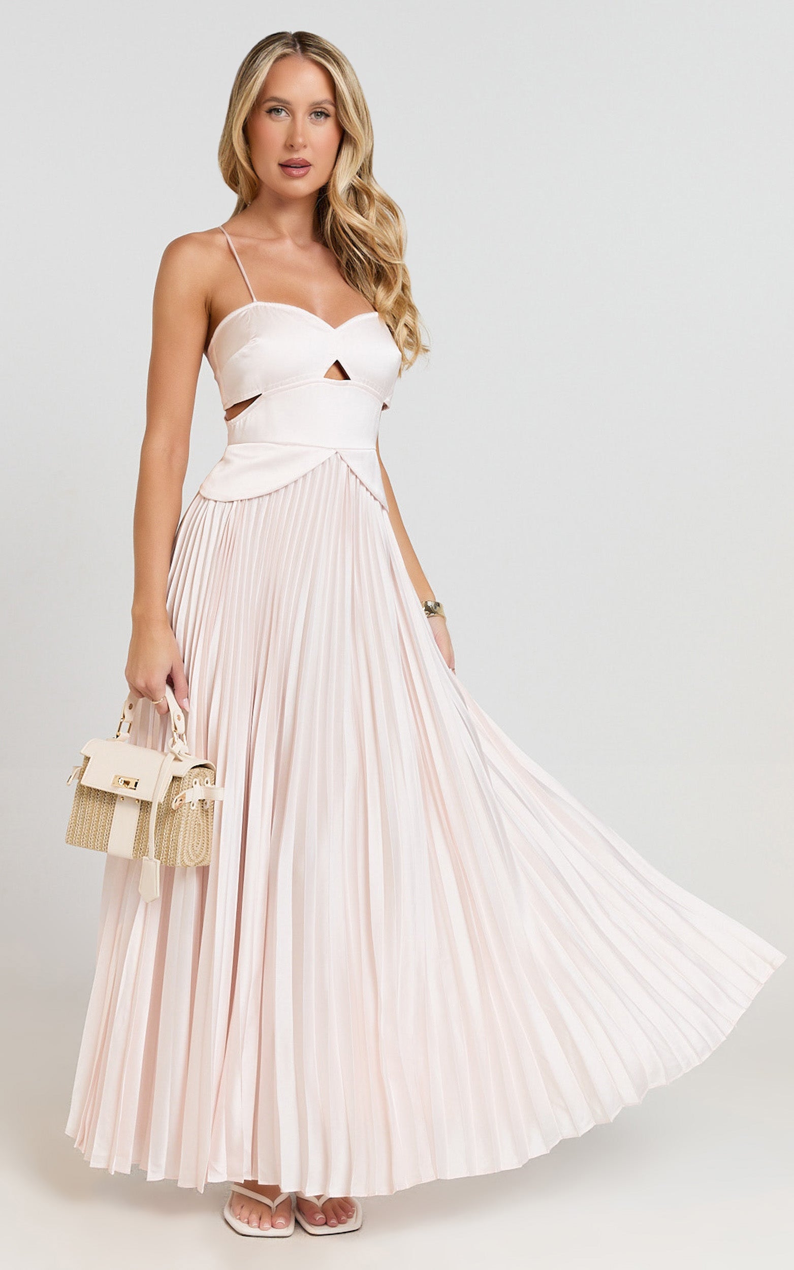 A pleated skirt flows with every step while the fitted bodice snatches the waist, giving that flattering, feminine silhouette made for celebrations and sunset plans. Minimalist yet a total statement piece, it balances flirty cut-outs with a timeless maxi length for effortless elegance in the Dresses lineup.