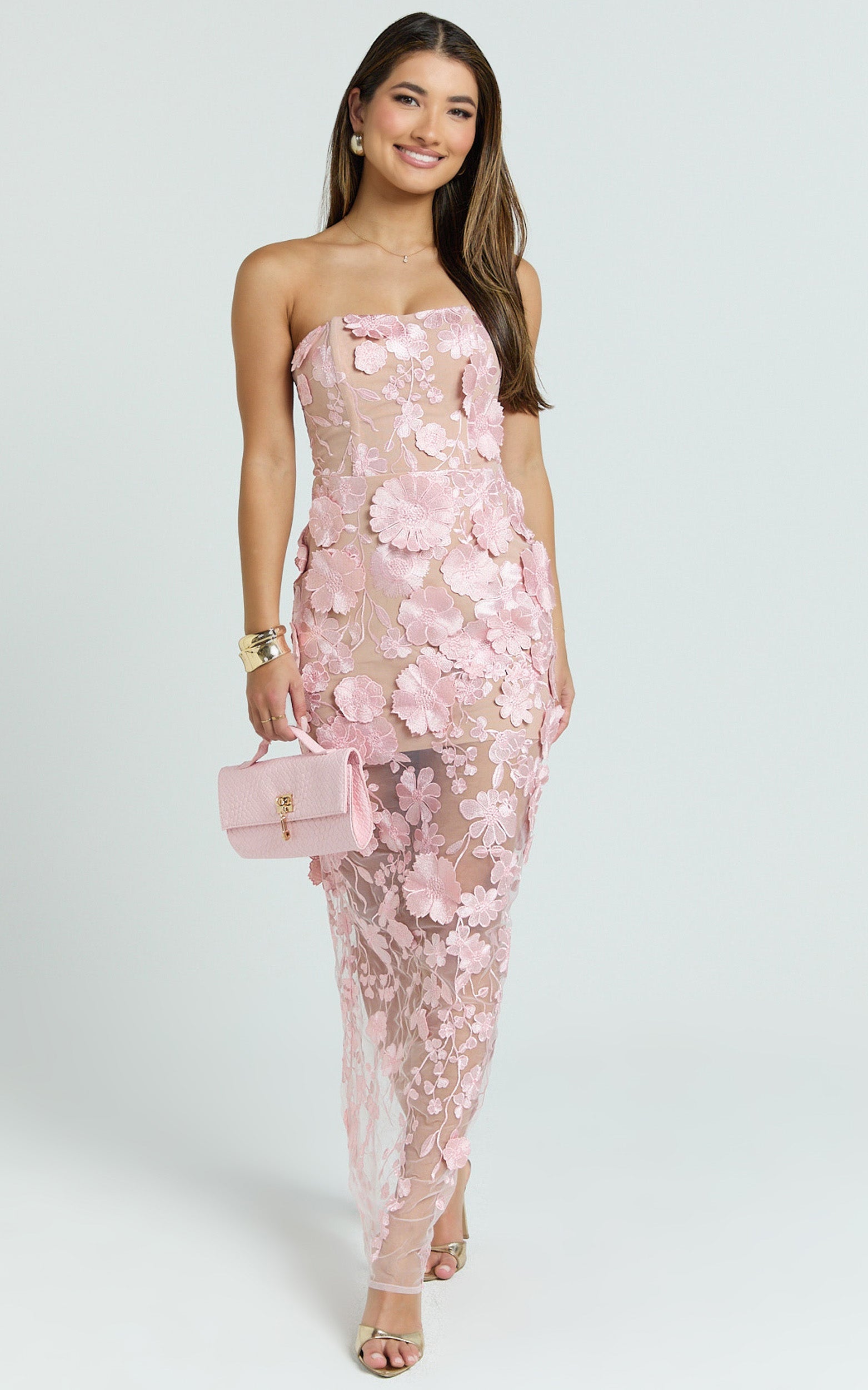 Sienna Maxi Dress - 3D Floral Strapless Column Dress in Pink brings that modern fairy-tale vibe to your Dresses rotation. Style it with minimalist heels and a delicate clutch to let the florals do the talking, then finish with glowy makeup and a sleek bun for a gallery-opening-ready moment. Think picture-perfect, dance-floor-proof, and destined to rack up compliments.
