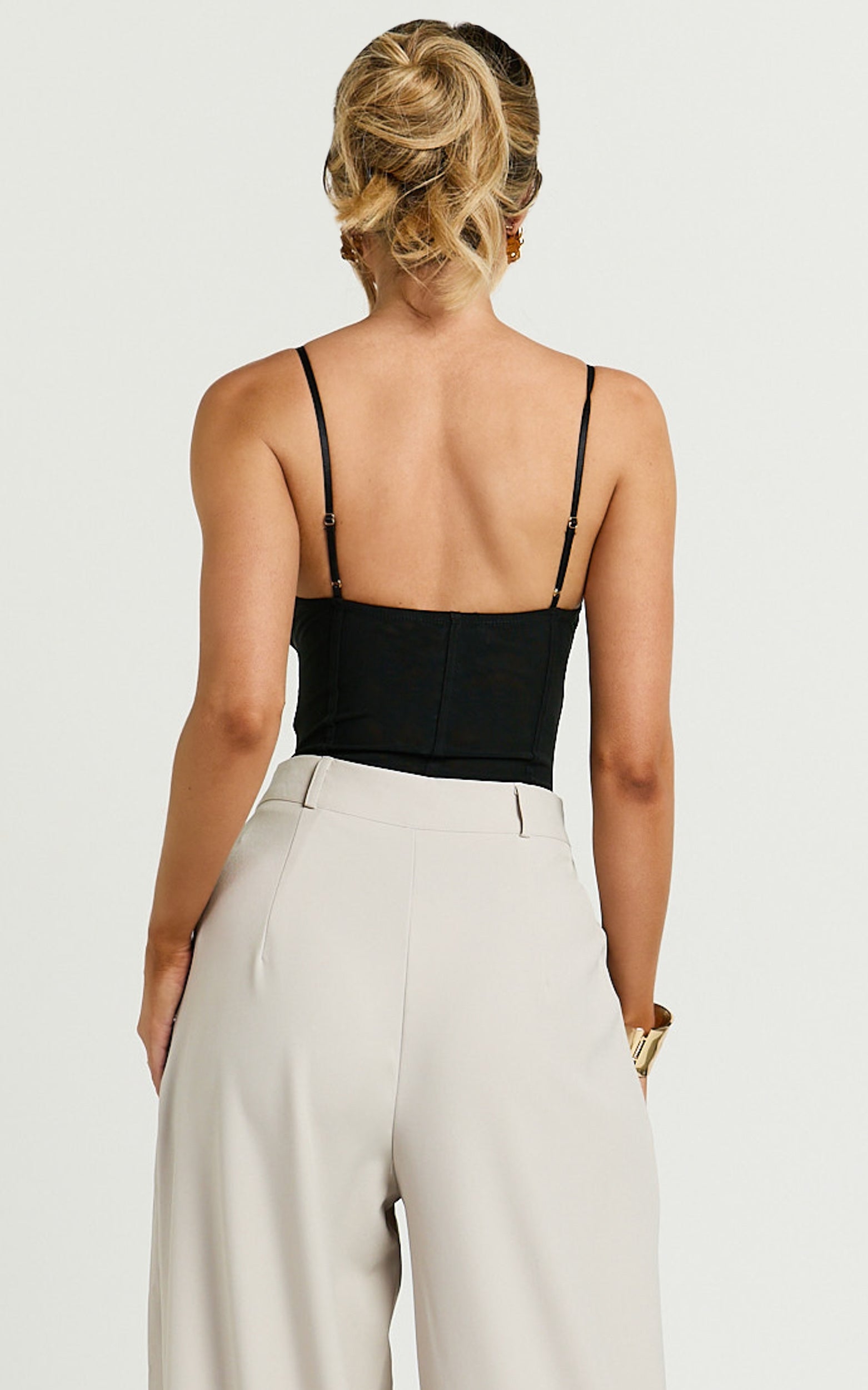 Discover the perfect look in our Sofia Bodysuit - a Bustier Netting Bodysuit in Black that's designed to empower and inspire confidence in every wearer. This isn't just a bodysuit; it's a statement piece for the bold and the beautiful, the dreamers and the doers. It's where fashion meets comfort, crafted meticulously from soft, stretchy polyester and delicate mesh that hugs your shape in all the right places while ensuring you stay comfortable throughout the day and into the night.