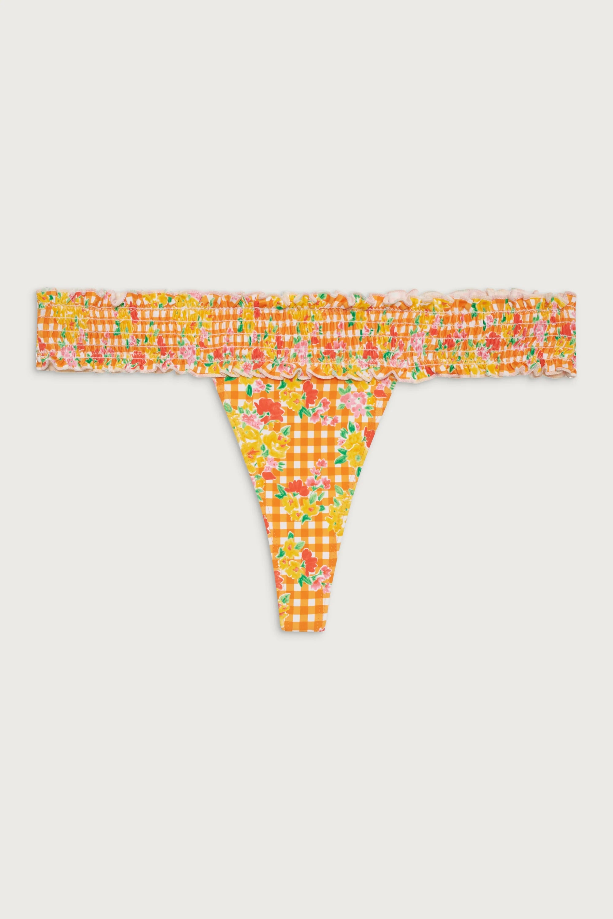 Less is more with the teeny Sofia bikini bottom, featuring stretchy smocking textures and a new floral gingham print. This micro bikini bottom is designed for bikini lovers seeking a flattering elastic waistband and low-rise fit. Get a little bit of everything when you pair Sofia with the matching Rosabella bandeau bikini top.