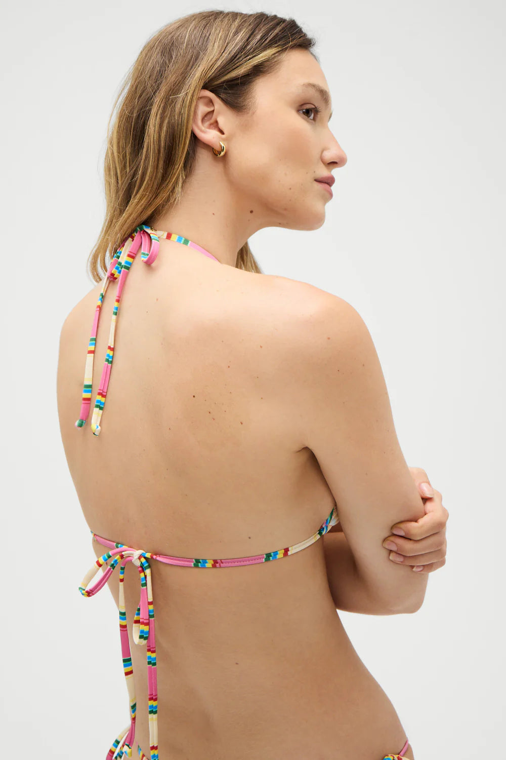 The Sunrise bikini top features micro triangle coverage, adjustable back and neck ties, and a new vintage-inspired striped print, Mood Ring.