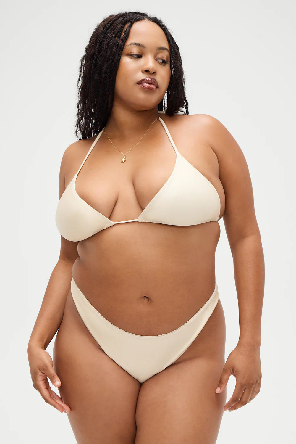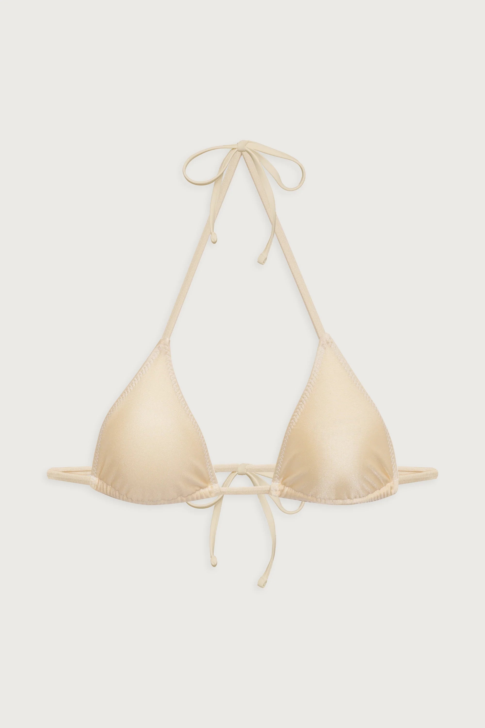 The Sunrise bikini top features micro triangle coverage, adjustable back and neck ties, glistening shine fabric, and our newest neutral, Sand Castle.
