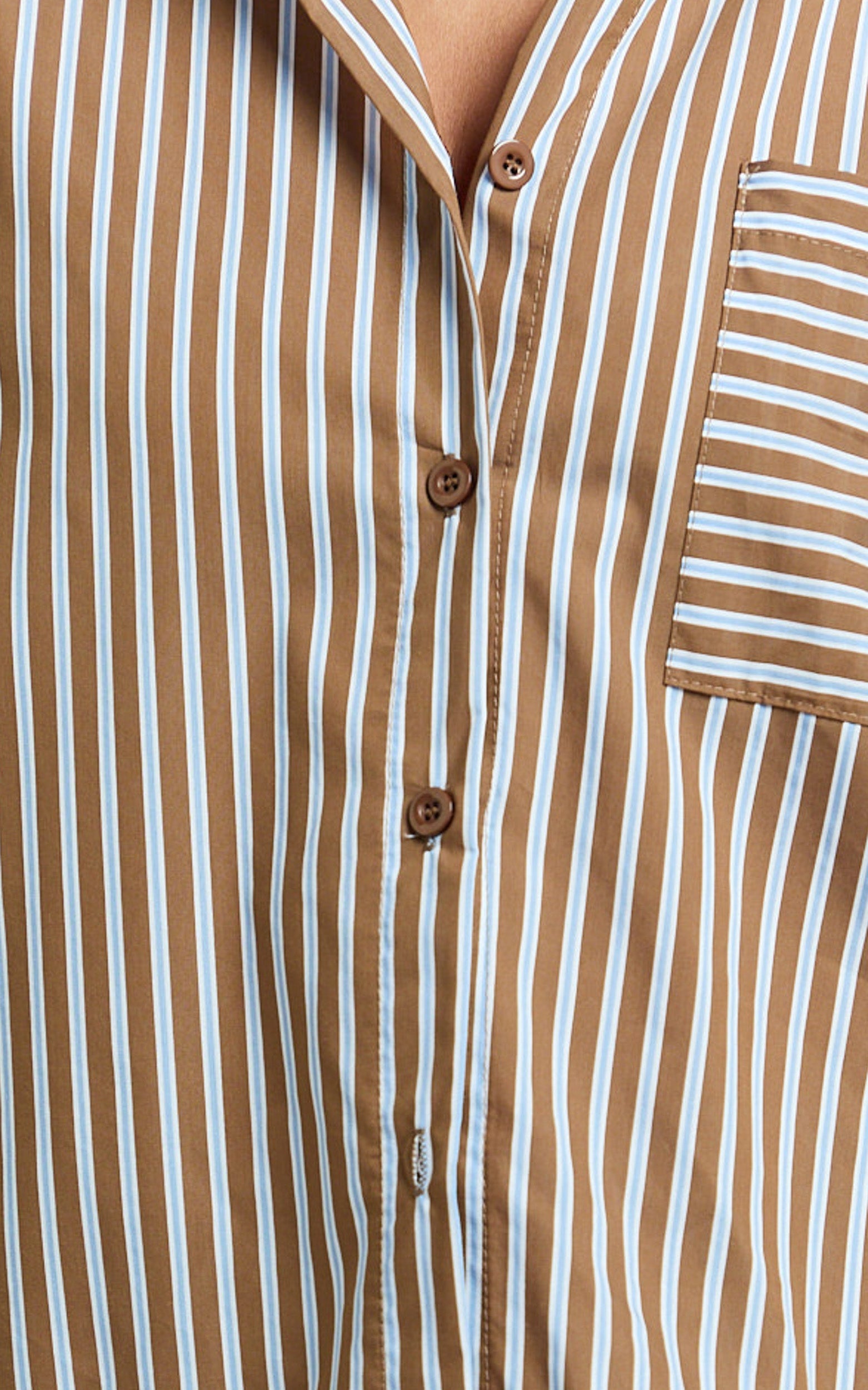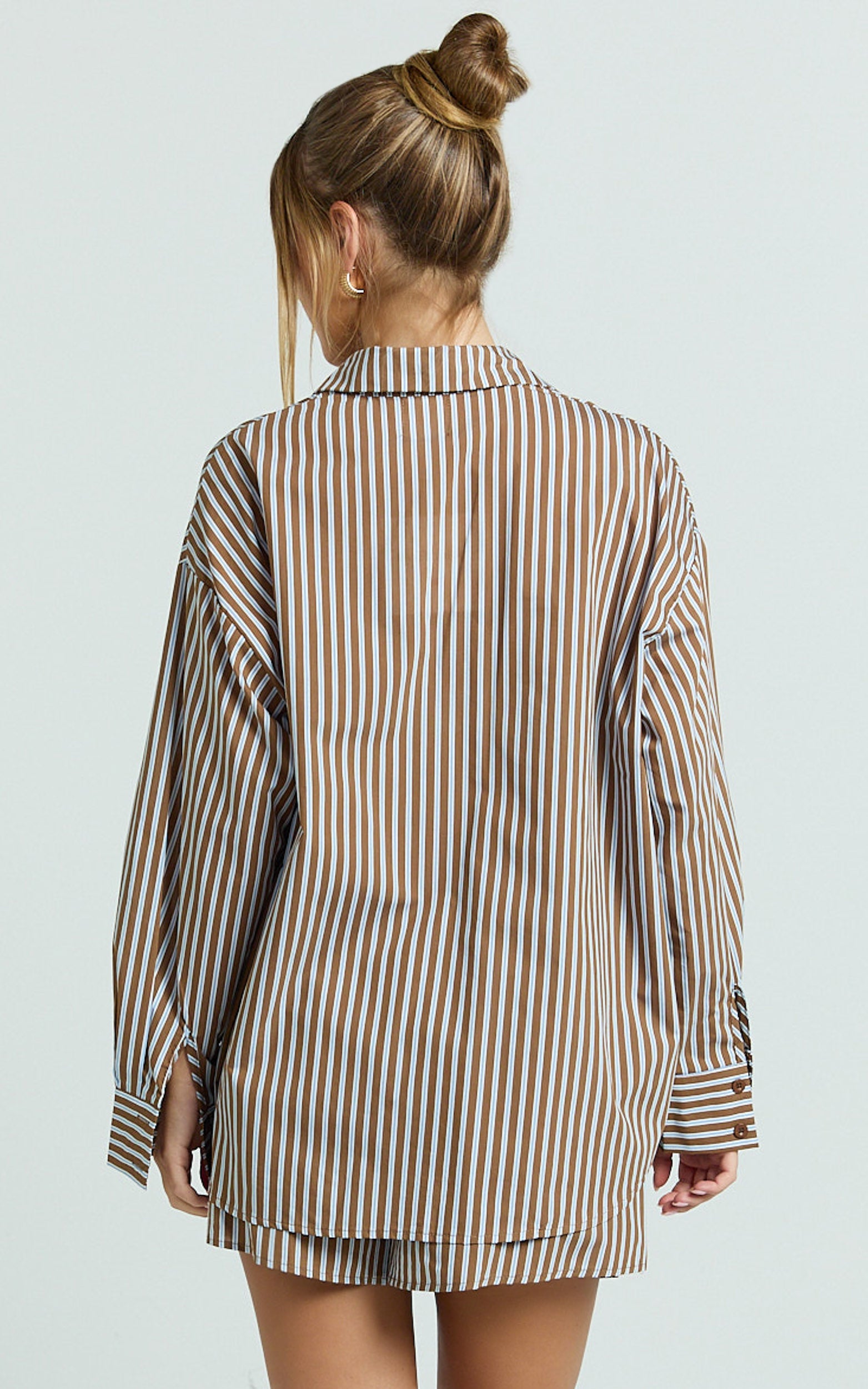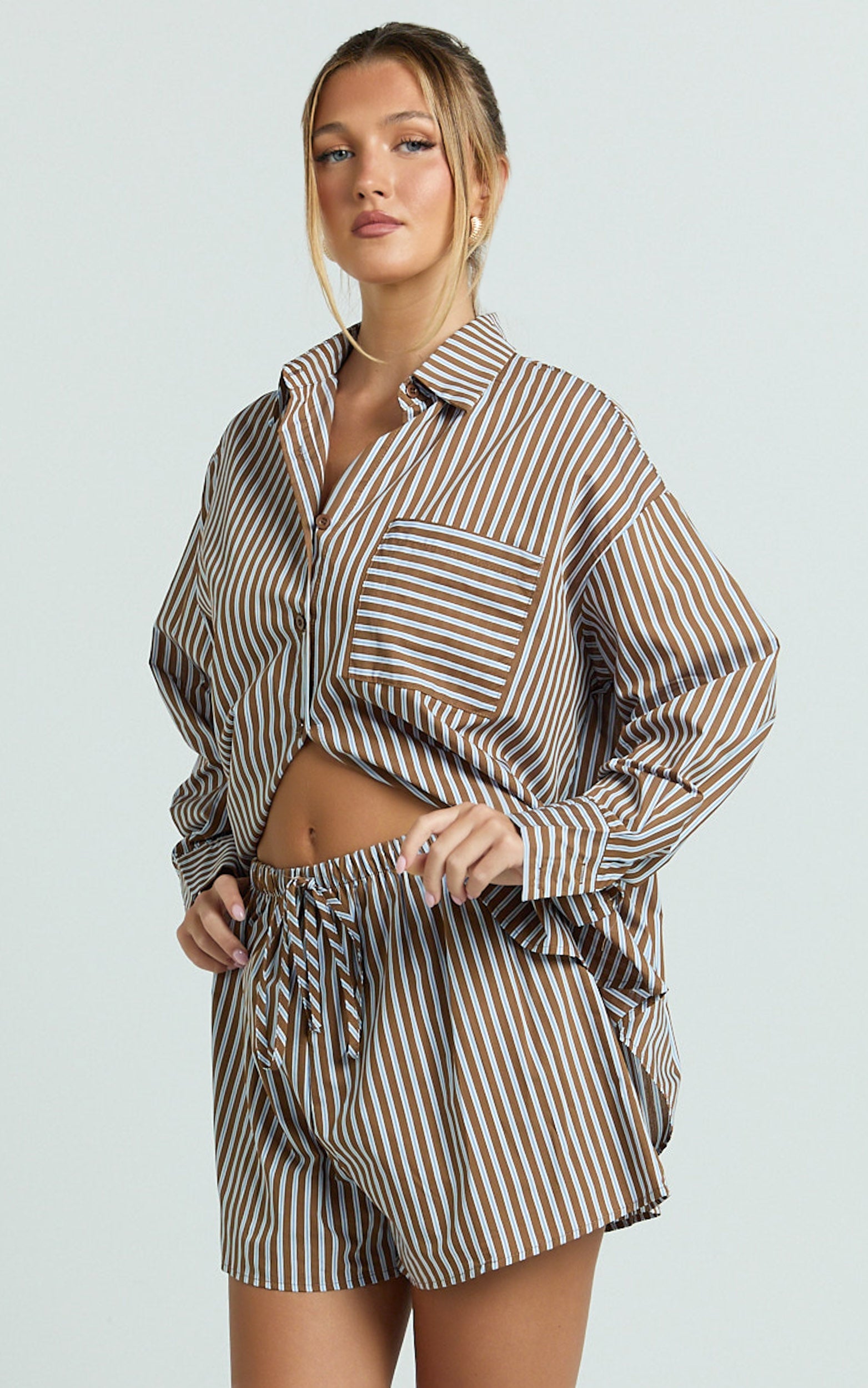 Talia Naomi Two Piece Set - Shirt And Short Set In Brown Stripe is your shortcut to outfit chemistry, wear together for a pulled-together moment or mix the shirt with denim shorts and the shorts with Summer whites for endless rotation. The easy-breezy fit flatters without fuss, making this co-ord a go-to for Co-ord Shorts lovers who want comfort, versatility, and maximum cute with minimum effort.