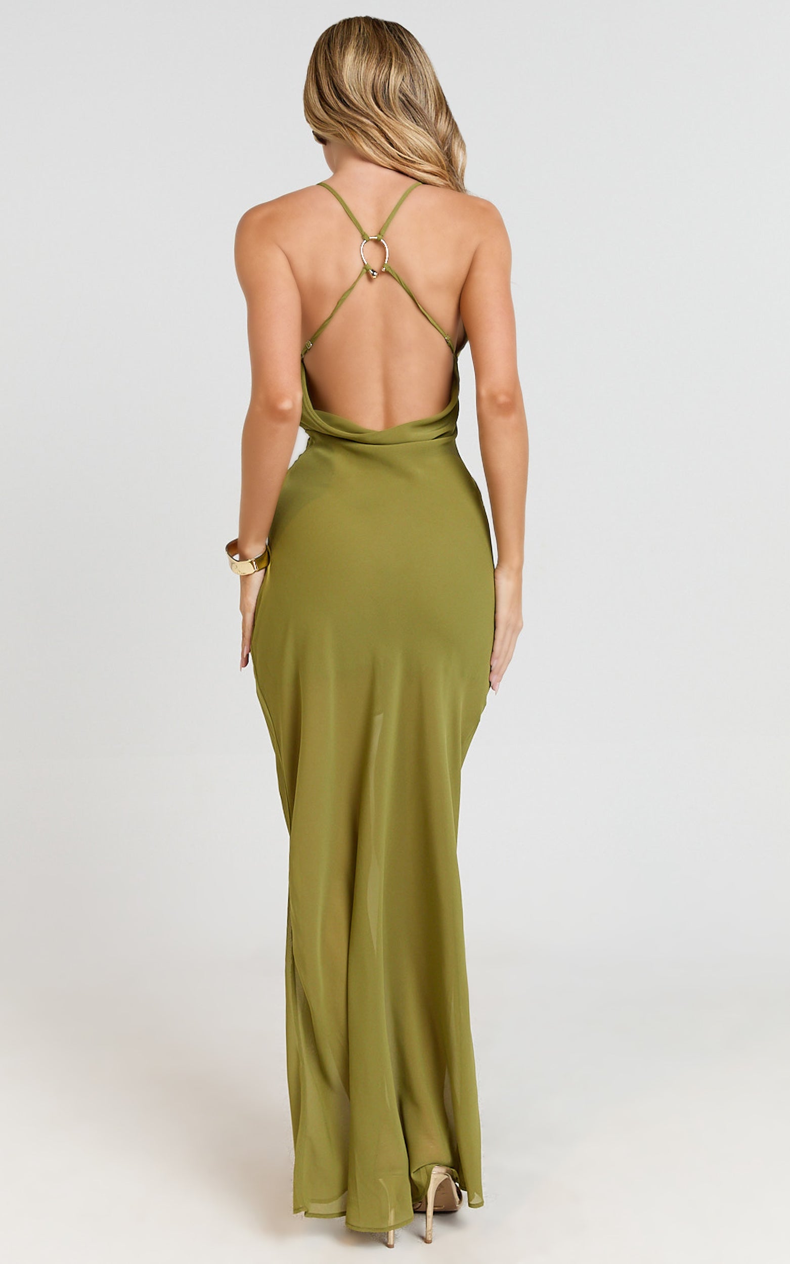 This plunging, ruched silhouette skims in all the right places, serving curve-loving energy with an open back that steals the spotlight. Floor-sweeping and photo-ready, it’s a Statement piece that leans Minimalist, effortless to wear, impossible to forget. Perfect for weddings, long lunches and nights that run late, the green hue brings fresh “it-girl” vibes to your Dresses lineup.