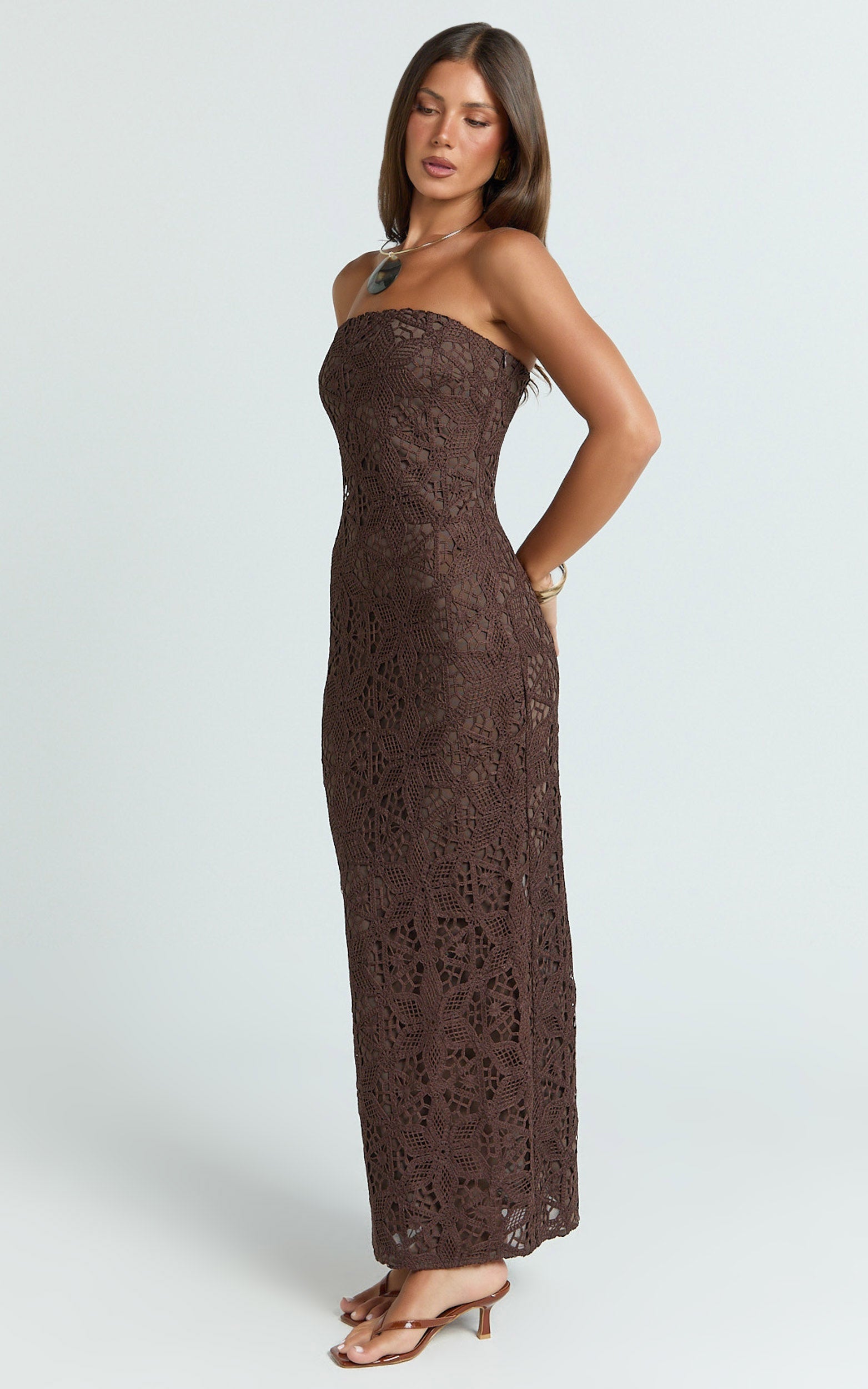 The Tamika Maxi Dress in Chocolate is effortless elegance with just the right amount of edge. The rich chocolate brown flatters every skin tone, while the crochet texture gives it dimension without feeling over the top. The strapless neckline frames your décolletage, and the straight column silhouette creates that long, sculpted look that always turns heads. This is the kind of dress that goes from rooftop drinks to birthday dinners without missing a beat. Keep it clean and refined with gold hoops, strappy neutral heels and a slouchy clutch, or add chunky bangles and slick hair for a bolder moment. Minimal effort, maximum impact - Tamika is that girl.