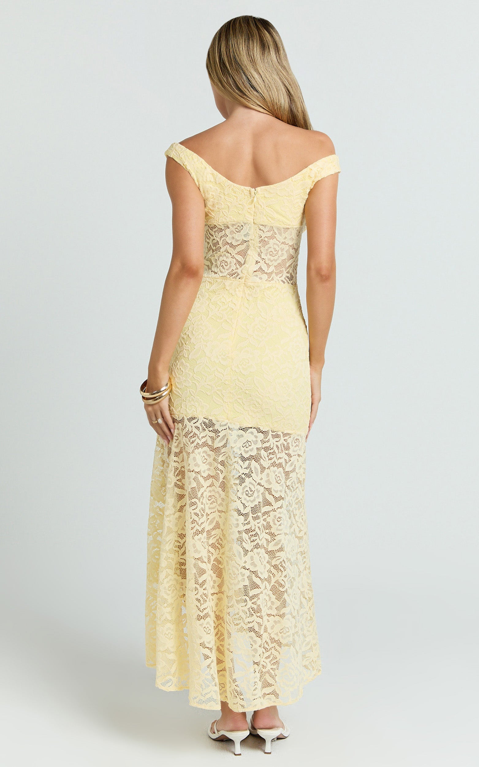 Introducing Tatum, your go-to for picture-perfect moments. The Tatum Midi Dress - Lace Off Shoulder Side Split Dress In Lemon brings soft lace texture, a sultry leg reveal and a silhouette made to flatter. Style it with delicate charm bracelets and sleek Y2K sunglasses to dial up the trend factor, then add your favourite heels and a micro bag for instant main-character energy.