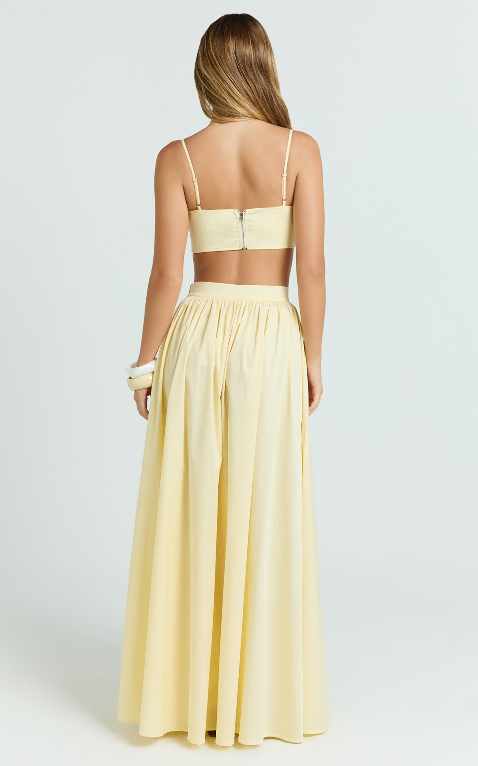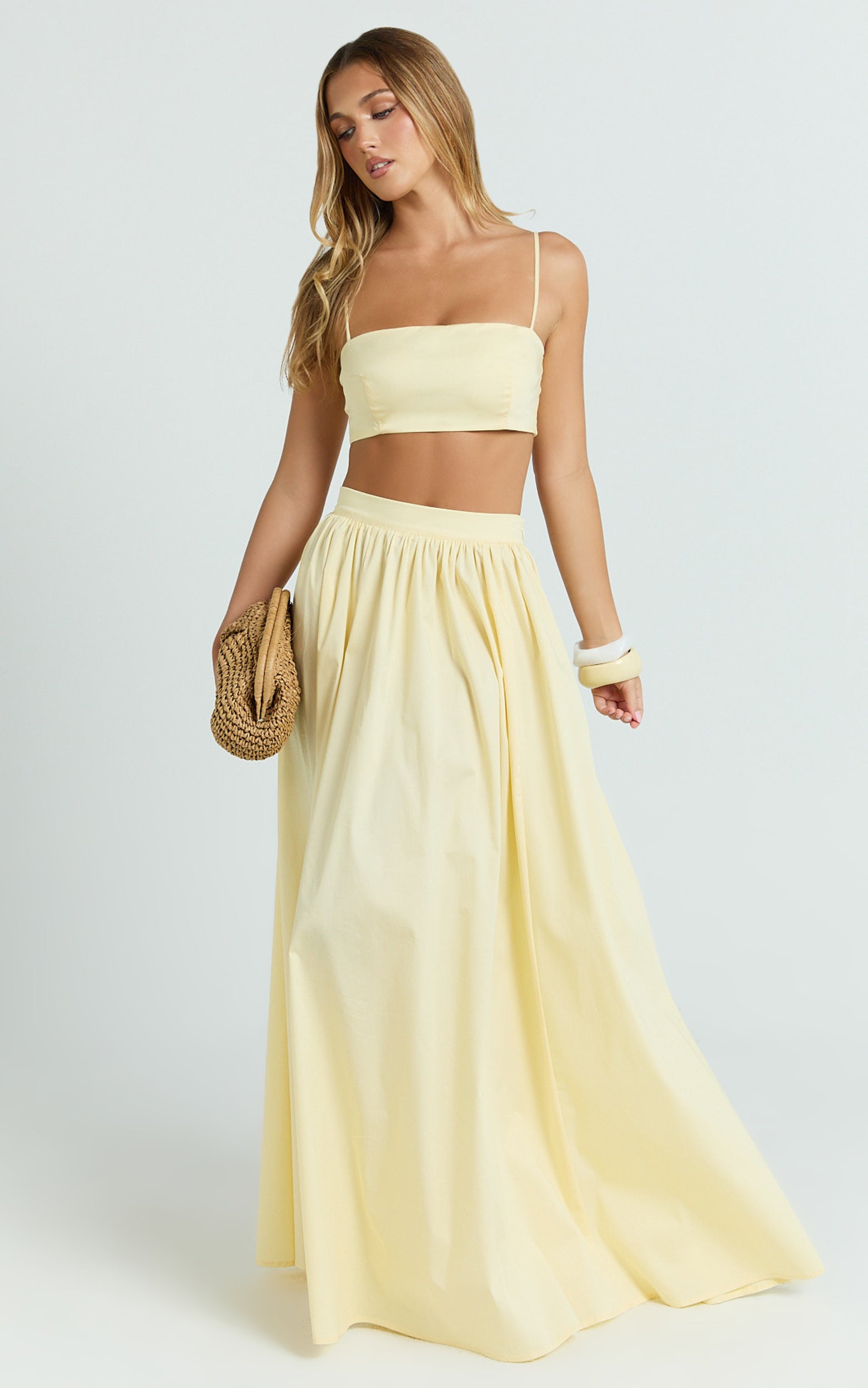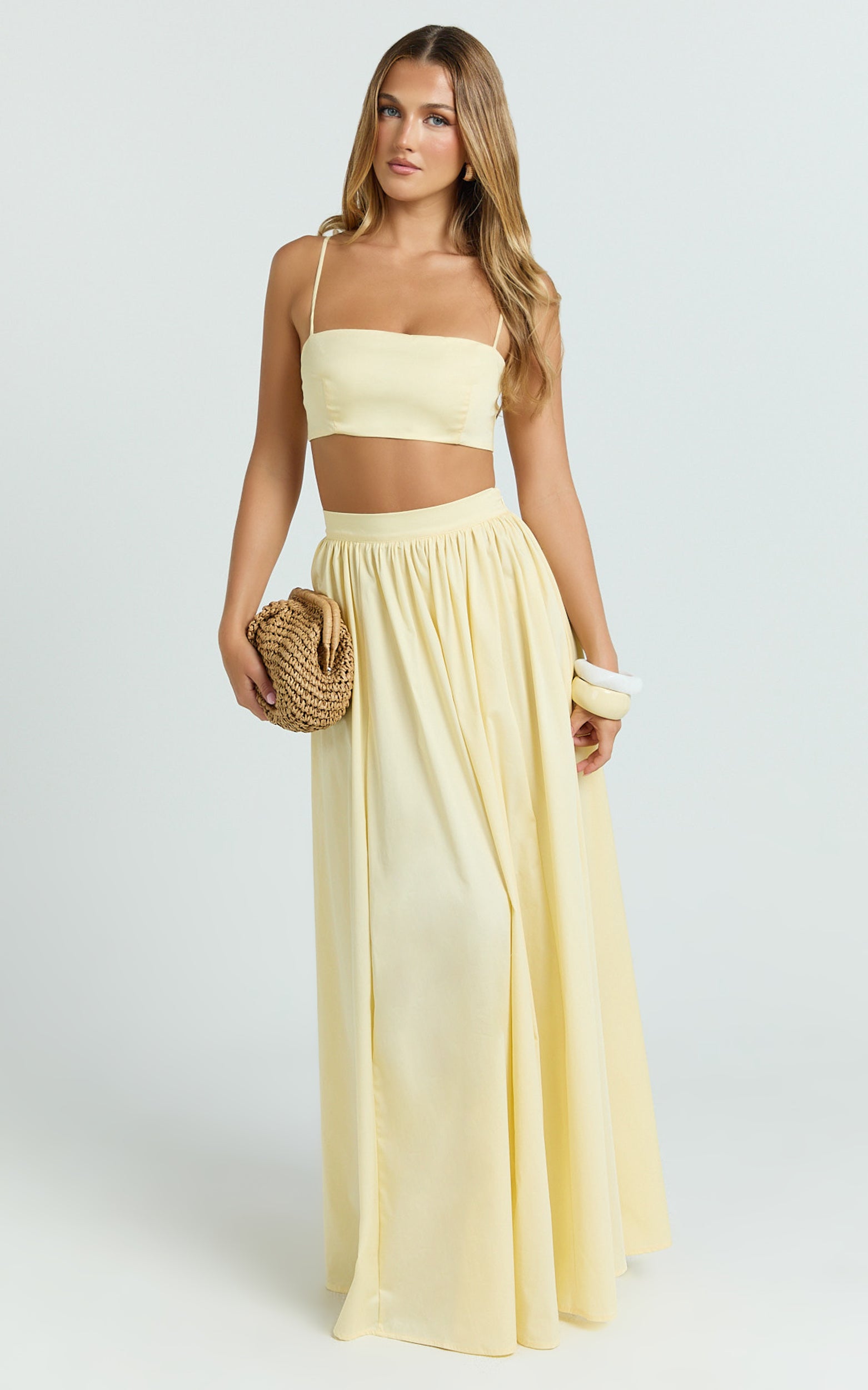 The Tegan Two Piece Set is pure sunshine energy. In soft butter yellow, it features a straight-neck micro crop and flowing A-line maxi skirt that moves beautifully with every step. The flattering high-rise waist and clean lines create an elongated silhouette, making it perfect for weddings, long lunches, or golden-hour cocktails. Style it with metallic heels for elevated polish or play up the fun with sculptural accessories for that modern, runway-inspired vibe. The soft hue pops against sun-kissed skin and photographs like a dream - the kind of set that makes you the moment. Mix, match, and wear it on repeat - it’s an instant mood-lift every time.