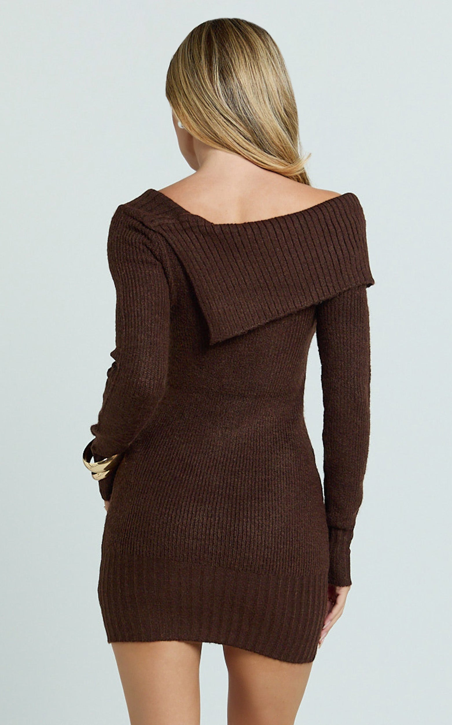 This asymmetric off-shoulder mini serves curve-skimming confidence with a single long sleeve and a sleek, body-hugging fit that flatters from every angle. The rich brown hue nails the Monochrome mood while the clean lines give it a Minimalist edge, perfect for date nights, cocktails, and everything after dark.