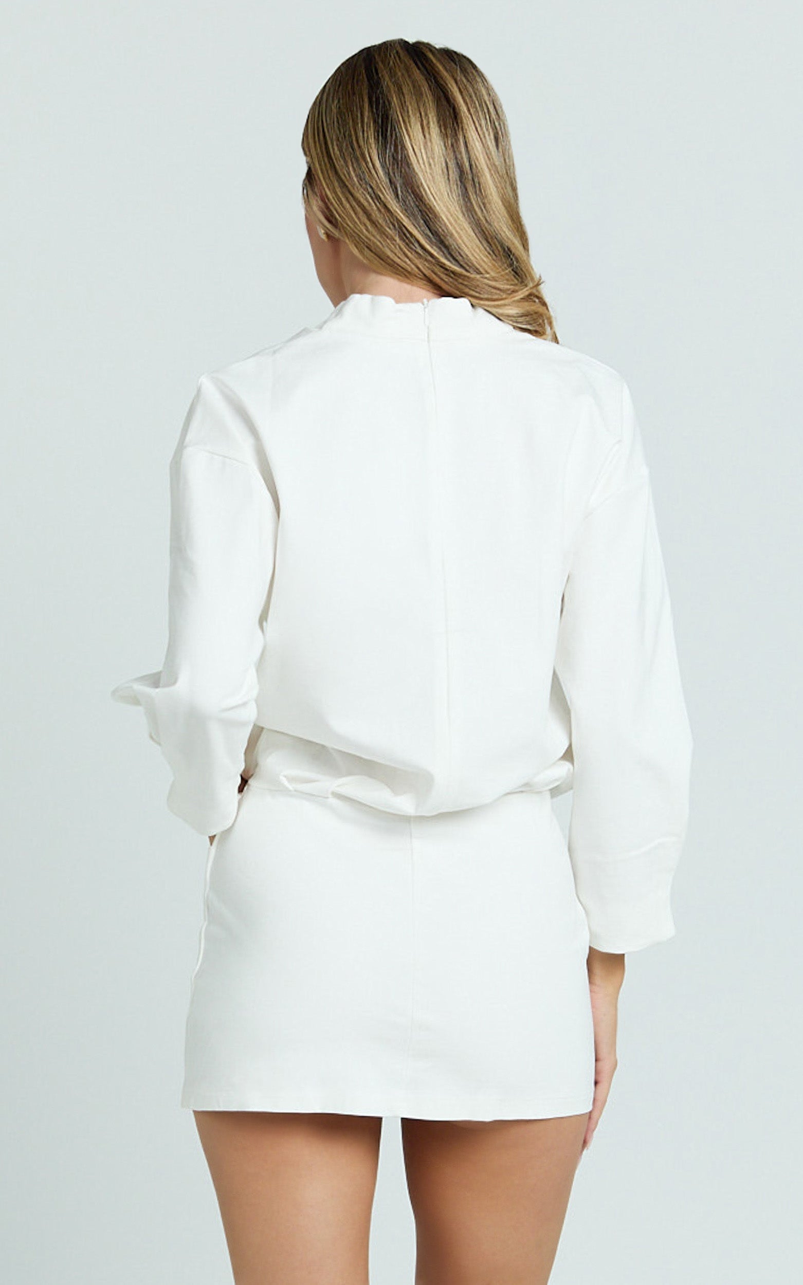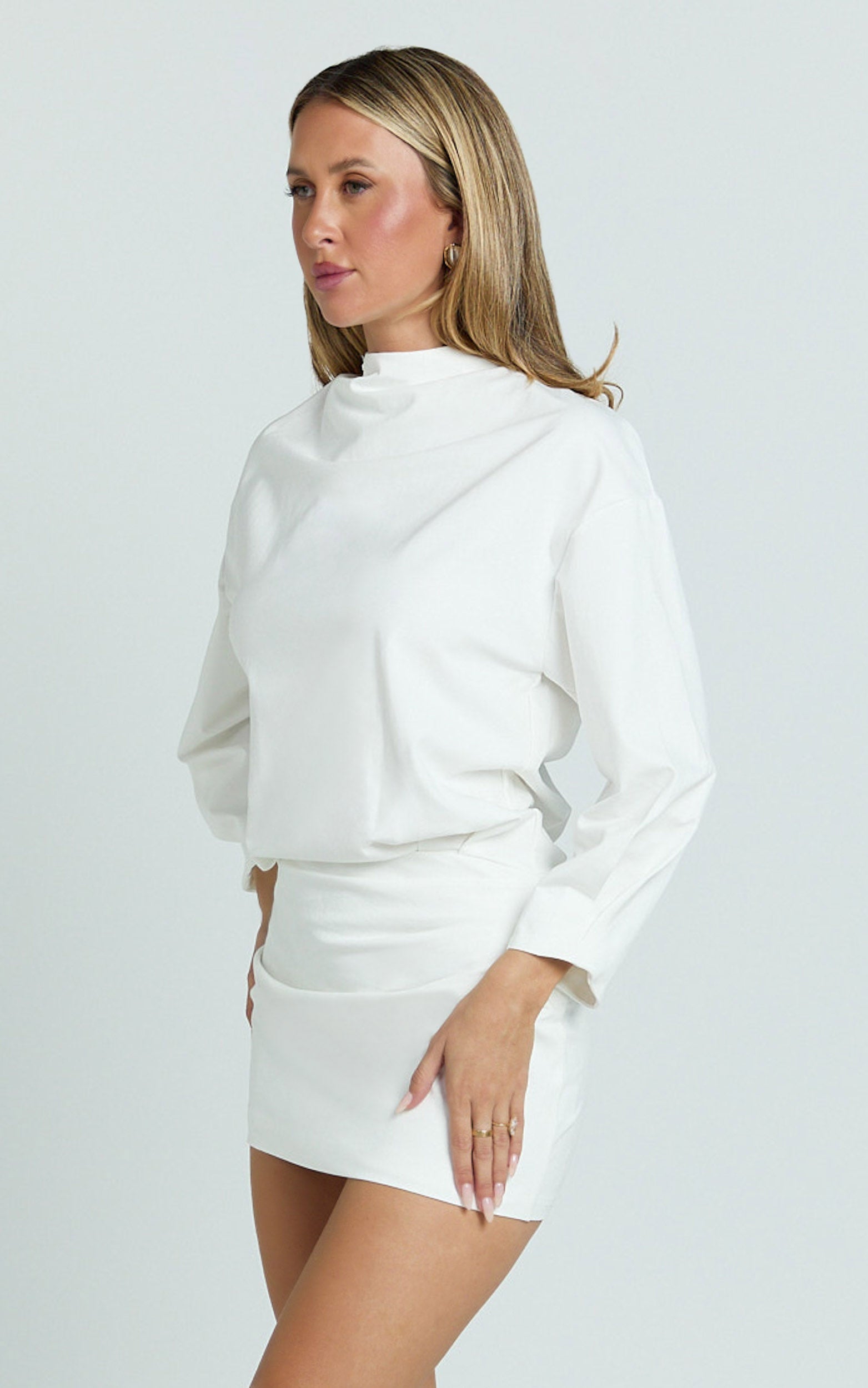 This high neck mini features statement drop shoulders and soft tulip sleeves that frame your silhouette while keeping things polished. The white tone feels fresh and luxe, serving clean-girl energy with a subtle nod to naked dressing, think minimal, refined, and effortlessly runway-coded. A straight-yet-flirty fit makes it perfect for desk-to-drinks, date nights, and everything in between.