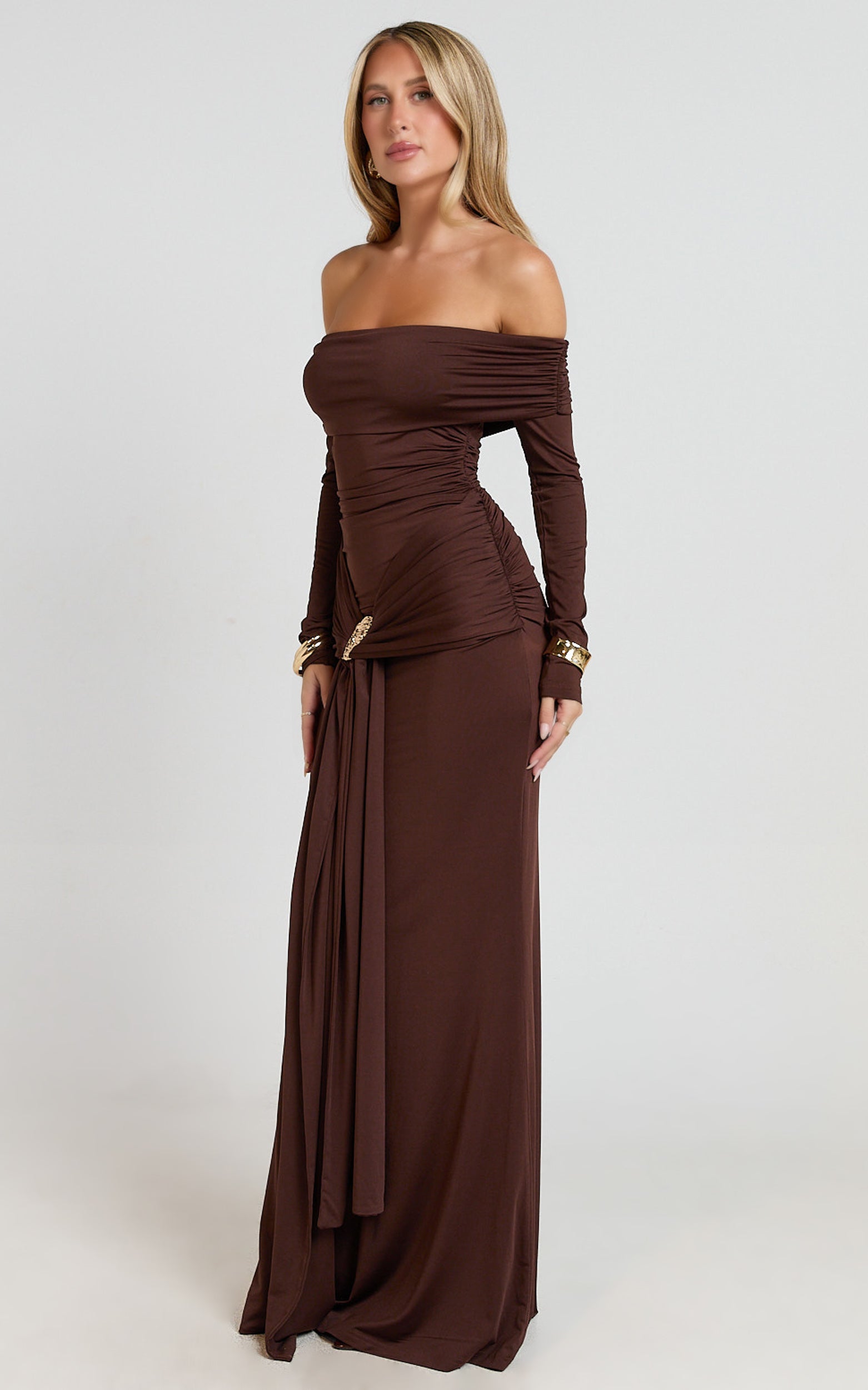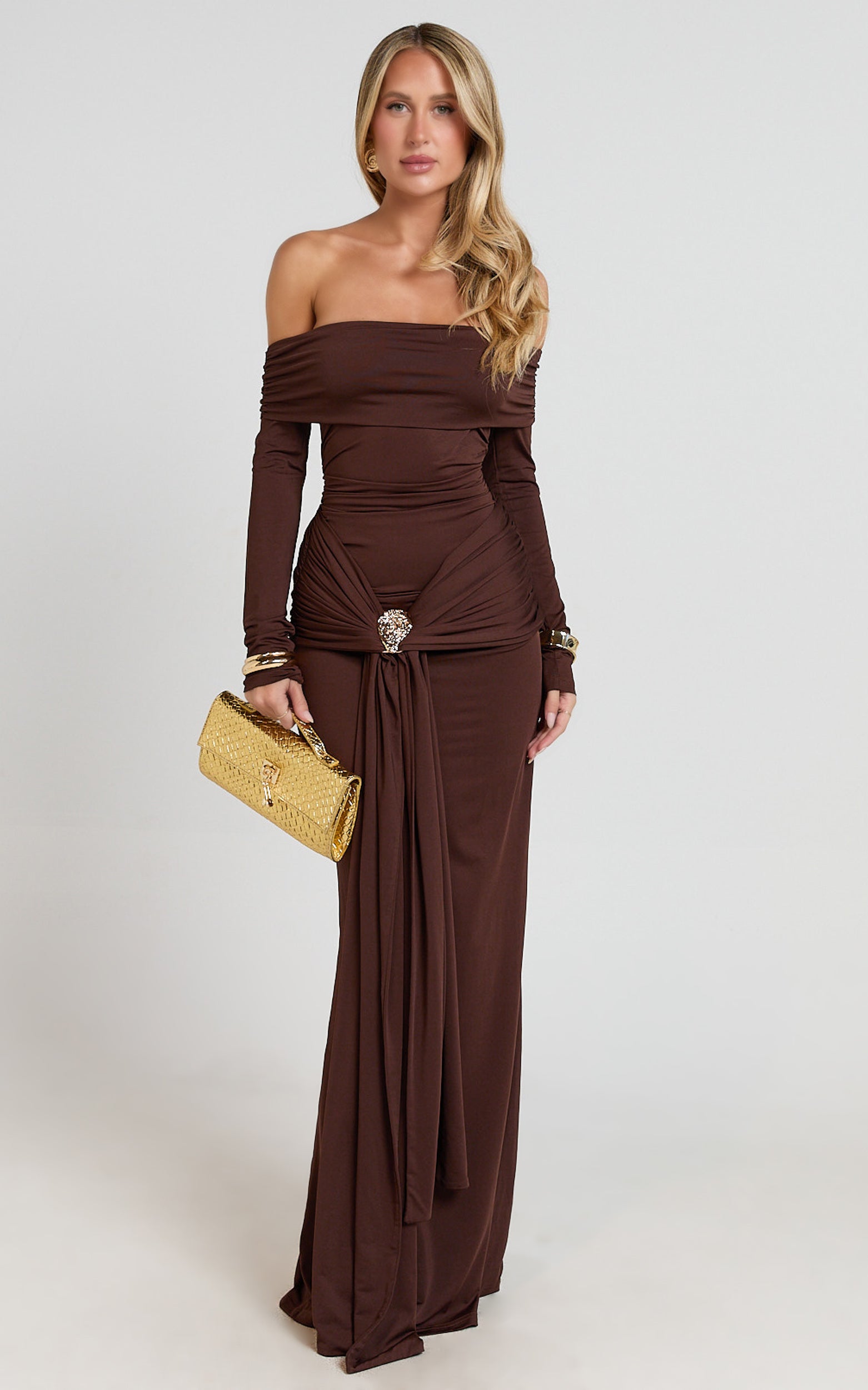 Trish Maxi Dress turns up the glamour with a fitted floor-skimming cut that’s perfect for weddings, date nights and cocktail events across AU, NZ, US and UK seasons. Style it with a pendant necklace to highlight the decolletage and finish with cool cuffs for a polished edge. Want a trend hit? Add oversized sunglasses by day or tap bowcore vibes with delicate accessories. This brown beauty is your go-to for chic, elevated dressing.