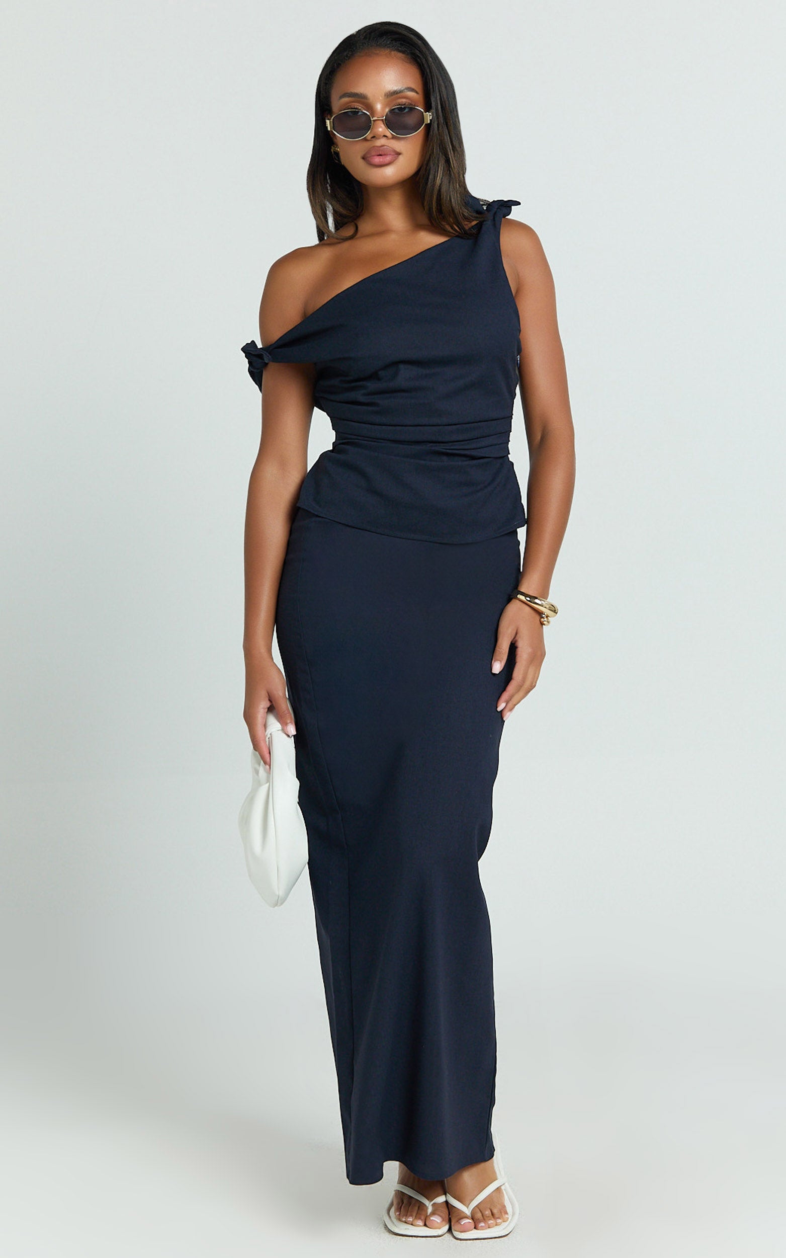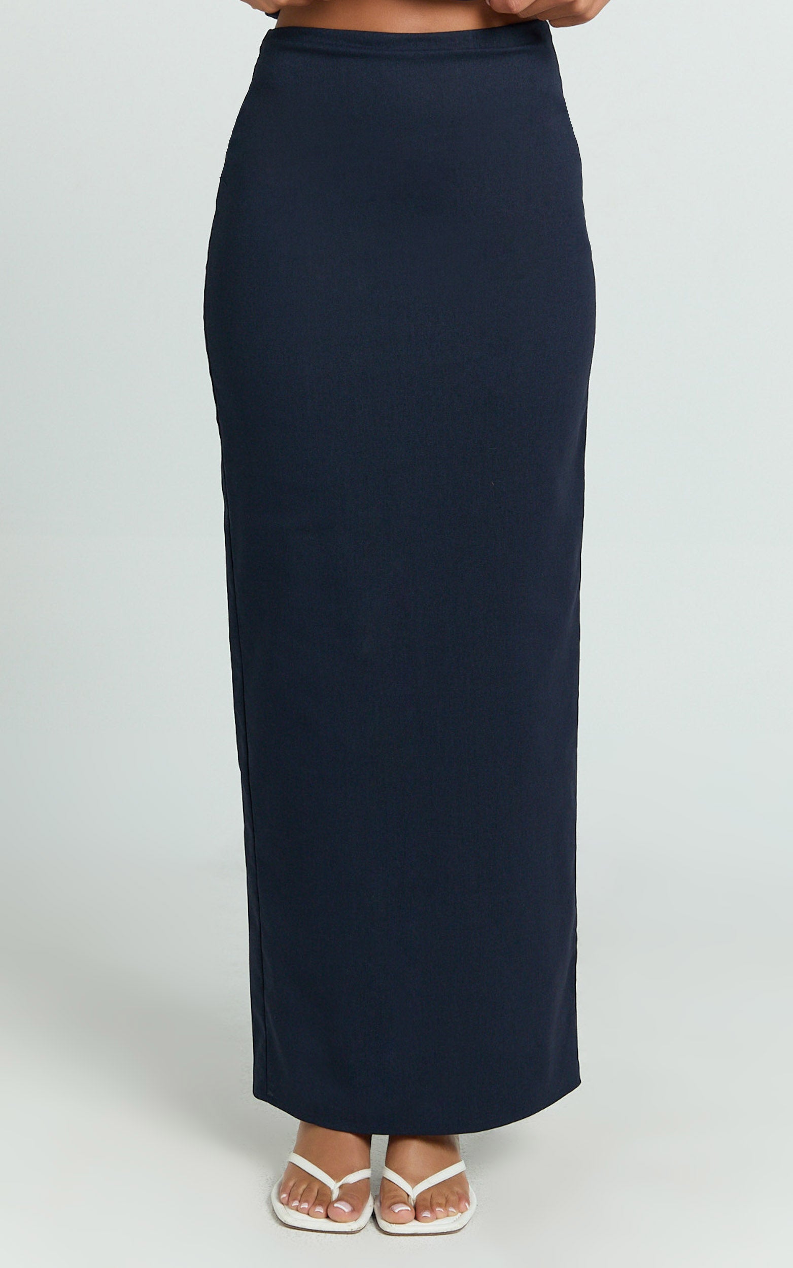 Vance plays perfectly with minimalist sandals for a clean finish or a pop of metallics to tap the ‘70s redux vibe. Dress it up with a fitted top and metallic sunglasses for night-out sparkle, or keep it pared-back with a simple tank and en-pointe ballet flats for effortless balance. The Vance Maxi Skirt - Linen Back Split Skirt In Navy is your new go-to for refined styling, easy rotation, and major repeat wear.