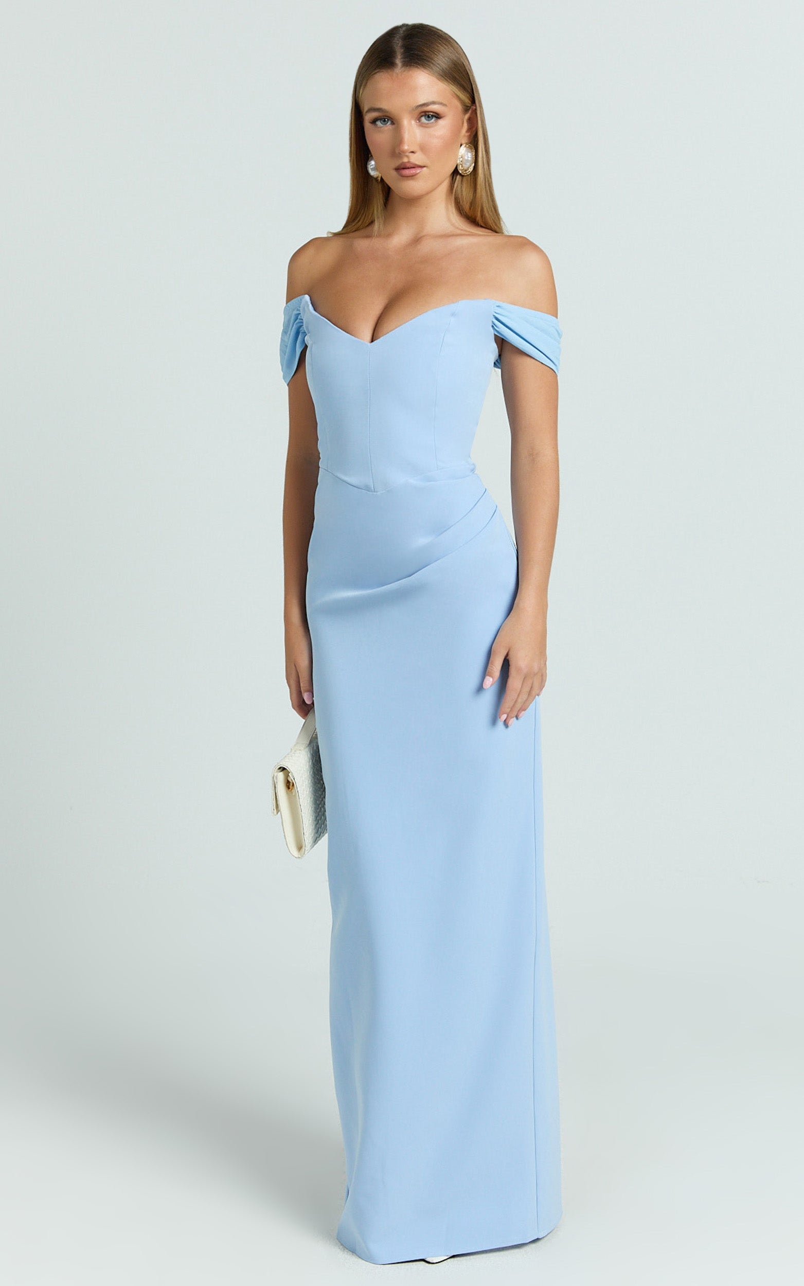 The Veronika Maxi Dress in Blue is sleek, sculpting, and sky-high confidence. Featuring an off-shoulder plunge neckline and a thigh-high split, it’s made for moments when you want the room to notice, bold, elegant, and totally main-character. Cinched through the bodice and flowing through the skirt, Veronika creates a long, leg-lengthening silhouette that’s ultra flattering from every angle. Style it with strappy heels and a barely-there clutch for evening polish, or switch to western-inspired boots for a fun, cool-girl contrast. However you play it, this blue maxi brings runway energy without the fuss.