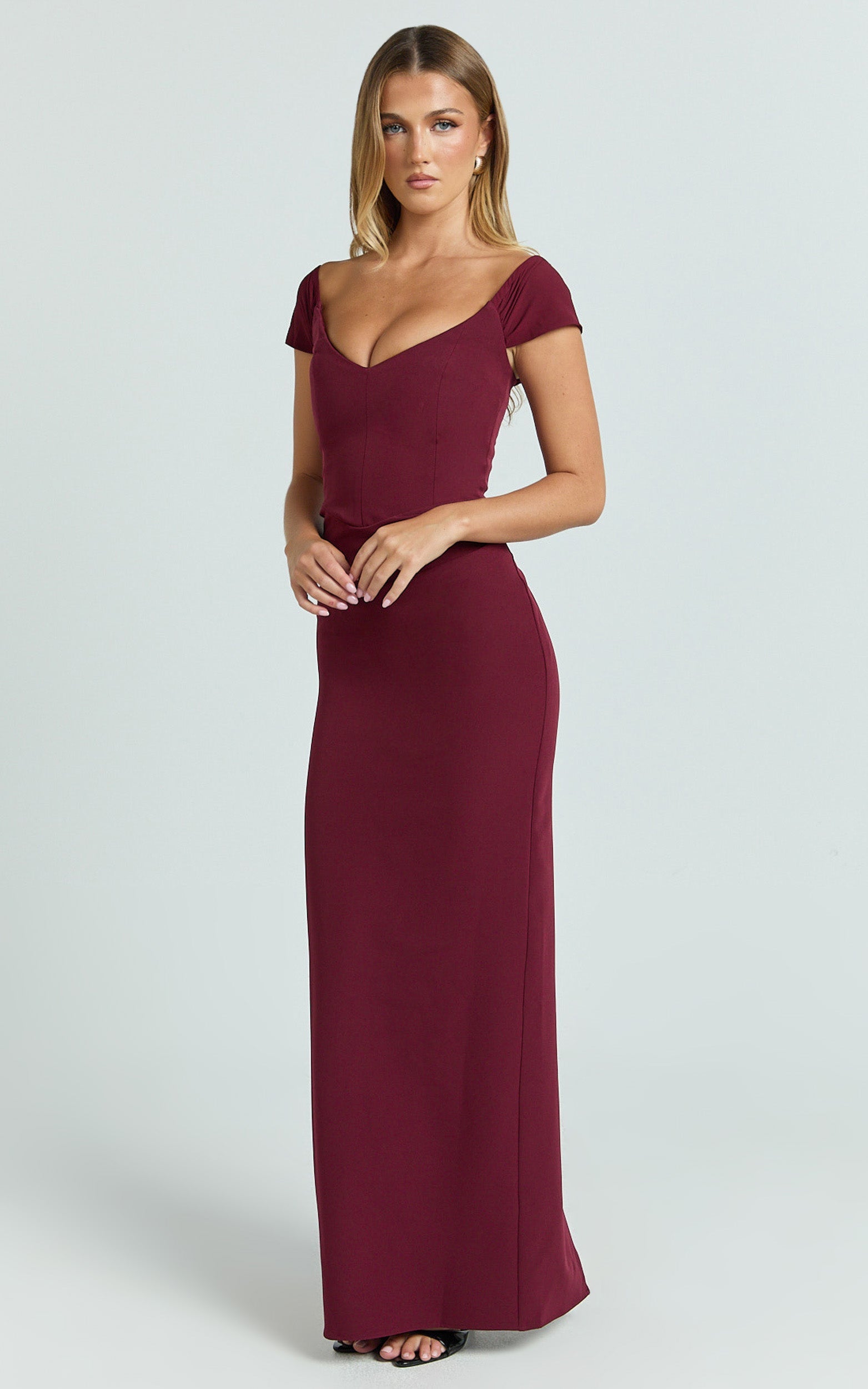 The Veronika Maxi Dress in Wine brings legs-for-days energy with a thigh-high split and a sleek, body-skimming fit that flatters and moves with you. Perfect for cocktails, weddings, and every RSVP in between, it’s a confidence boost in one zip, bold, elegant, and made to make an entrance. A plunging off-shoulder neckline and sculpted bodice take the spotlight, pairing seamlessly with strappy heels and a minimal clutch for evening polish. For a cool twist, style with western-inspired boots, or add subtle fringe accents in your accessories to tap into the trend. Either way, that rich wine tone does the talking.