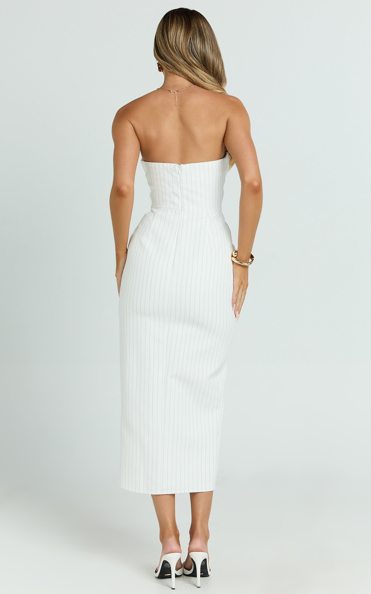 This fitted midi features a sleek side split to show a little leg while keeping it refined, think Quiet luxury energy for weddings, long lunches and after-dark plans. The crisp White hue pairs effortlessly with minimal heels and a mini clutch for that polished finish.