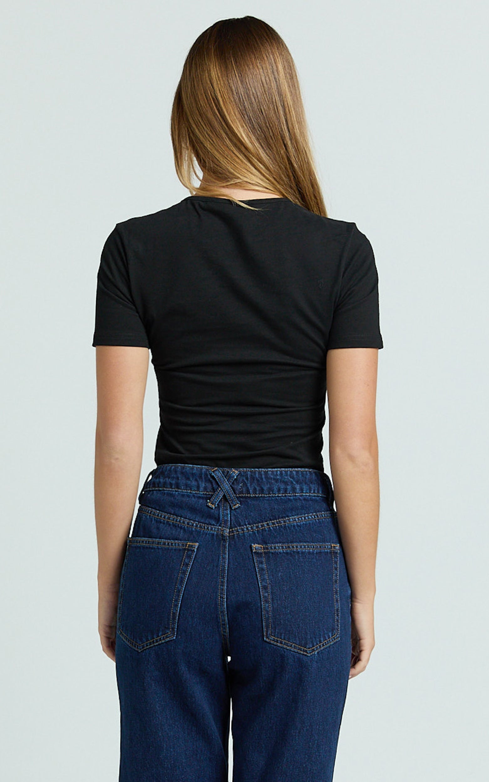 The Whitney T-Shirt nails elevated basics with a sleek high crew neckline and an elongated silhouette that skims just right. Clean, polished, and easy to style, it’s the kind of black tee that works for off-duty looks, night-out layers, and everything in between. Style Whitney tucked into tailored pants for a sharp finish, pair with a mini for going-out ease, or throw on with denim and chunky boots for the weekend. Add cuff bracelets or metal-tone accessories to dial up the polish. A true wear-on-repeat staple; streamlined, versatile, and always on point.