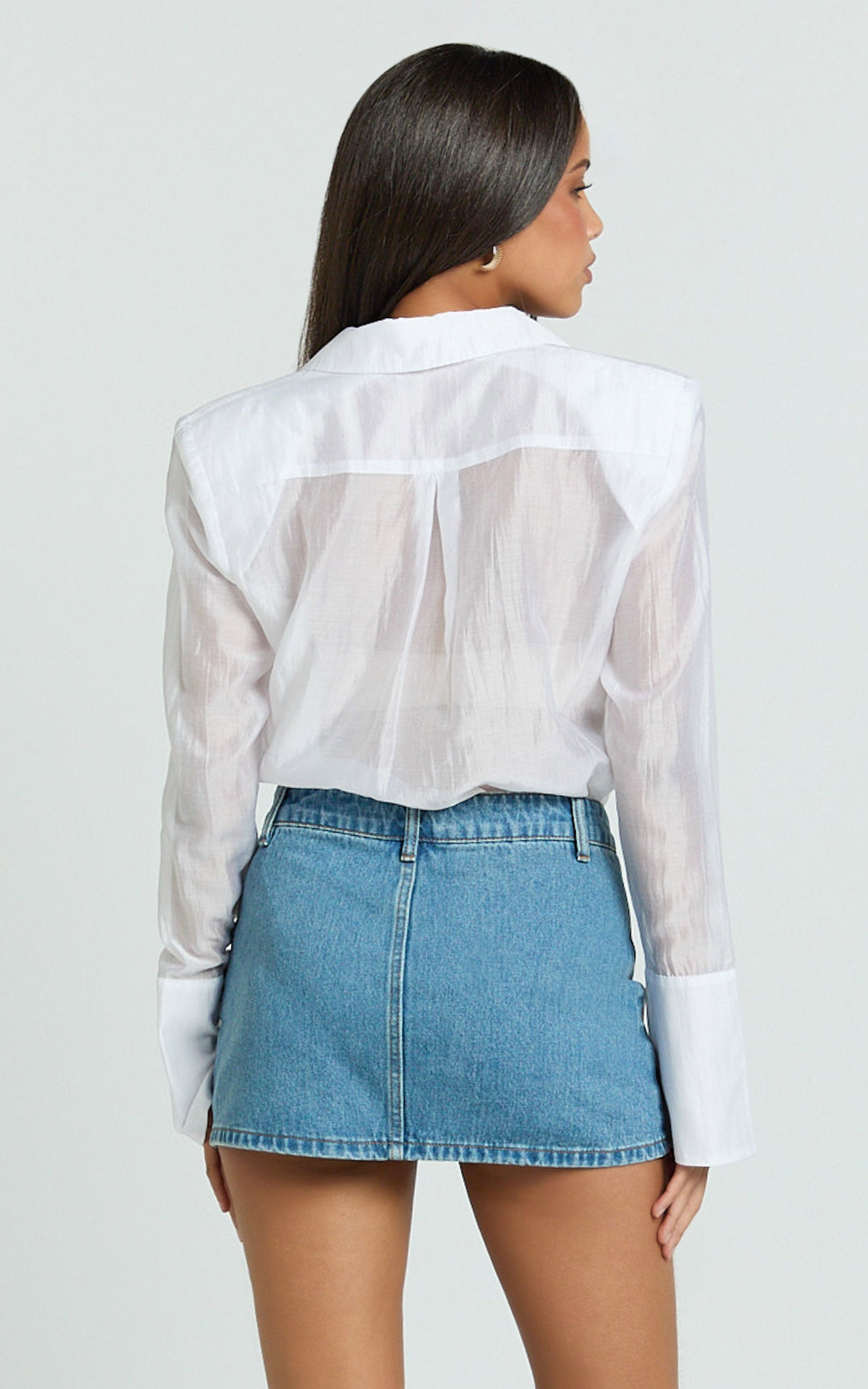 This button-down white bodysuit serves up a sharp square-shoulder silhouette that sculpts and elevates your everyday Tops lineup. Snap-in ease keeps it sleek and tucked, while the crisp neckline frames layered charm bracelets like a dream. Pair with tailored bottoms or go bold with micro shorts for that “Naked dressing, but make it refined” vibe, smooth, seamless, and ready for desk-to-dinner.