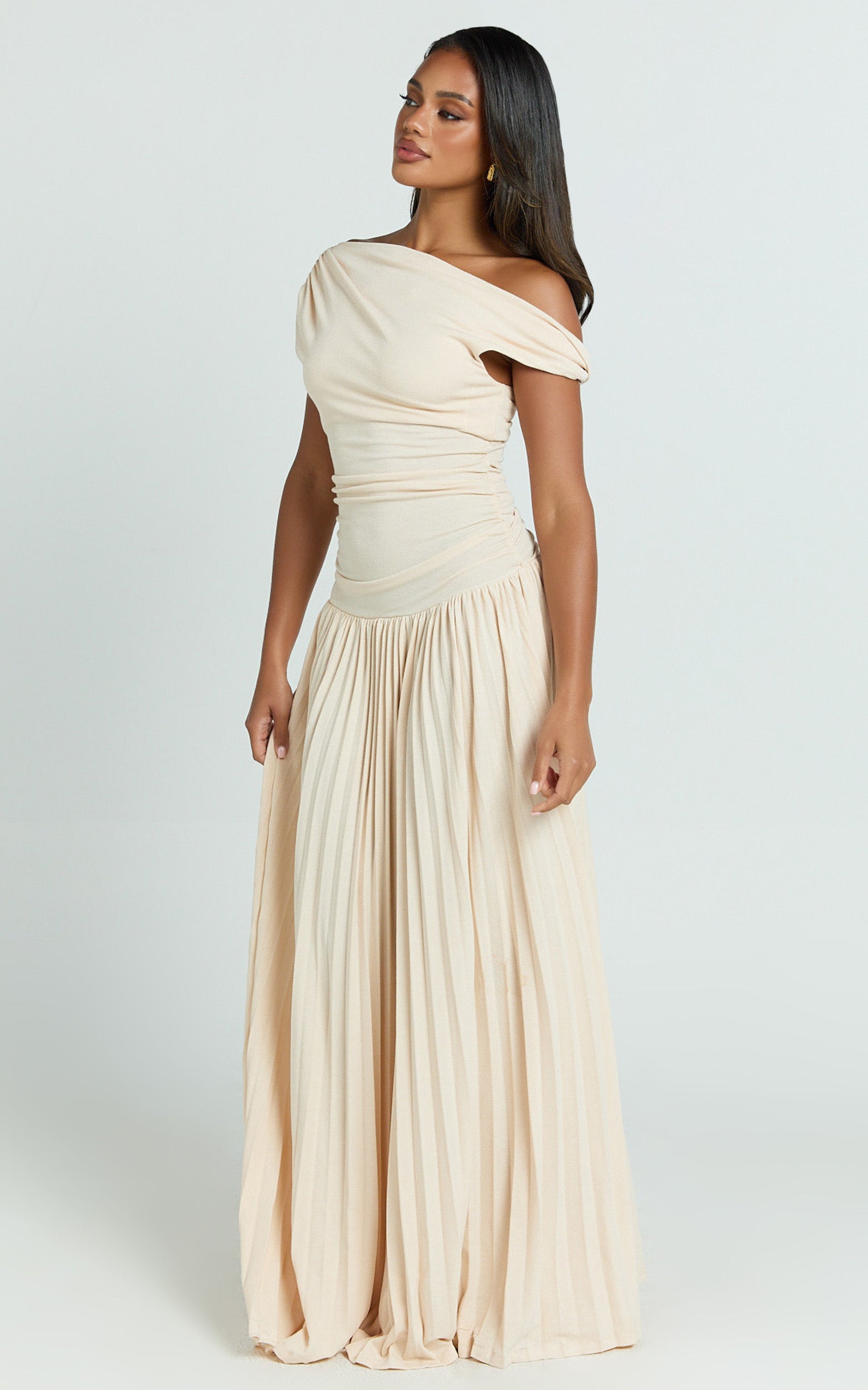 A tip-shoulder neckline and ruched bodice sculpt and flatter, while the pleat skirt flows with every step for that graceful swish. Think modern minimalism meets statement energy, perfect for weddings, special events, and white party moments. Trending notes? A touch of naked dressing influence keeps the silhouette fresh, while pairing with statement jewellery levels up the glow.
