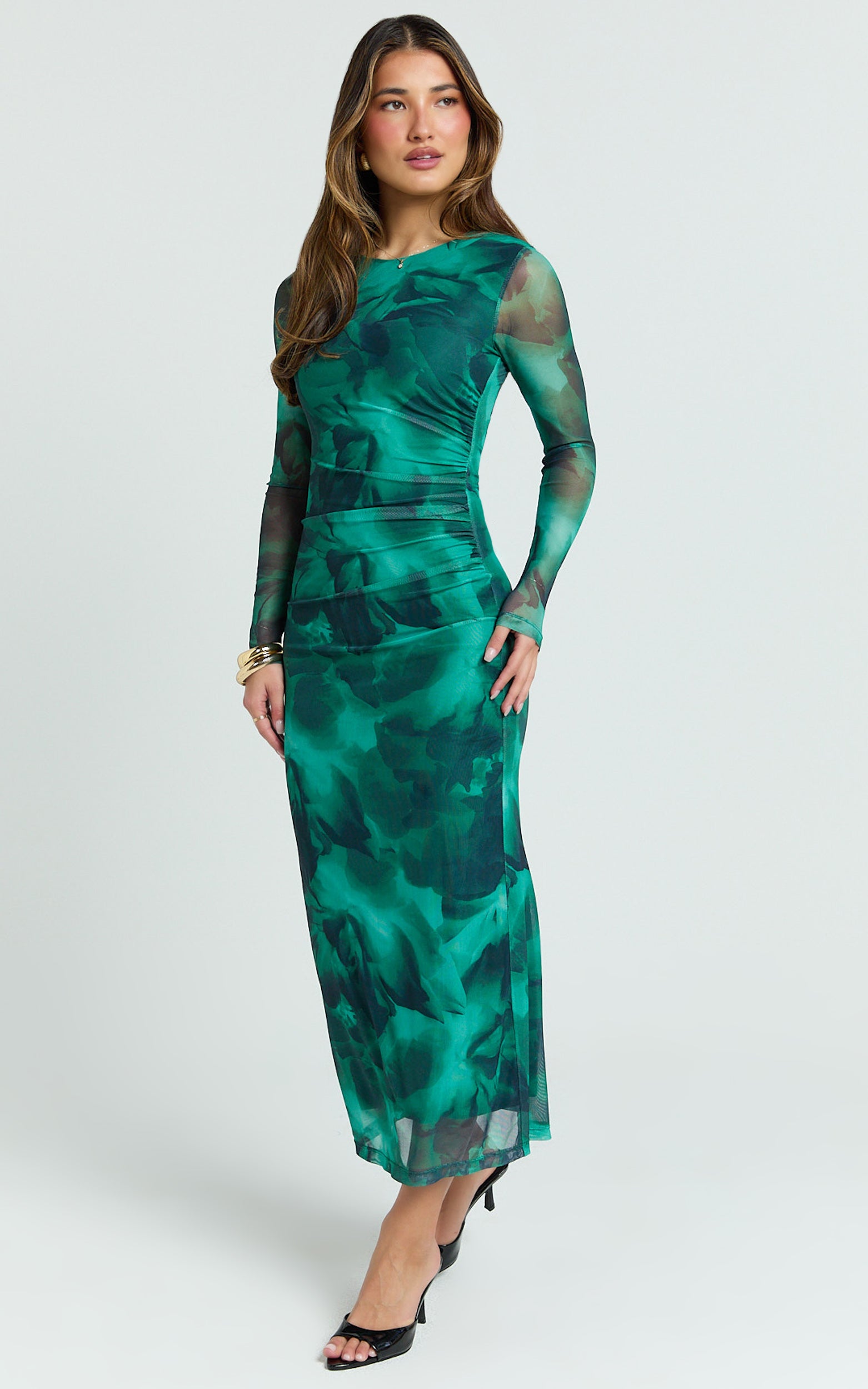 The blurred green print brings a touch of Maximalism while the body-skimming midi silhouette keeps it Quiet luxury, polished, photo-ready and perfect for any RSVP. Fashion-forward and flattering, this stunner moves with you and shows off shape without giving everything away.